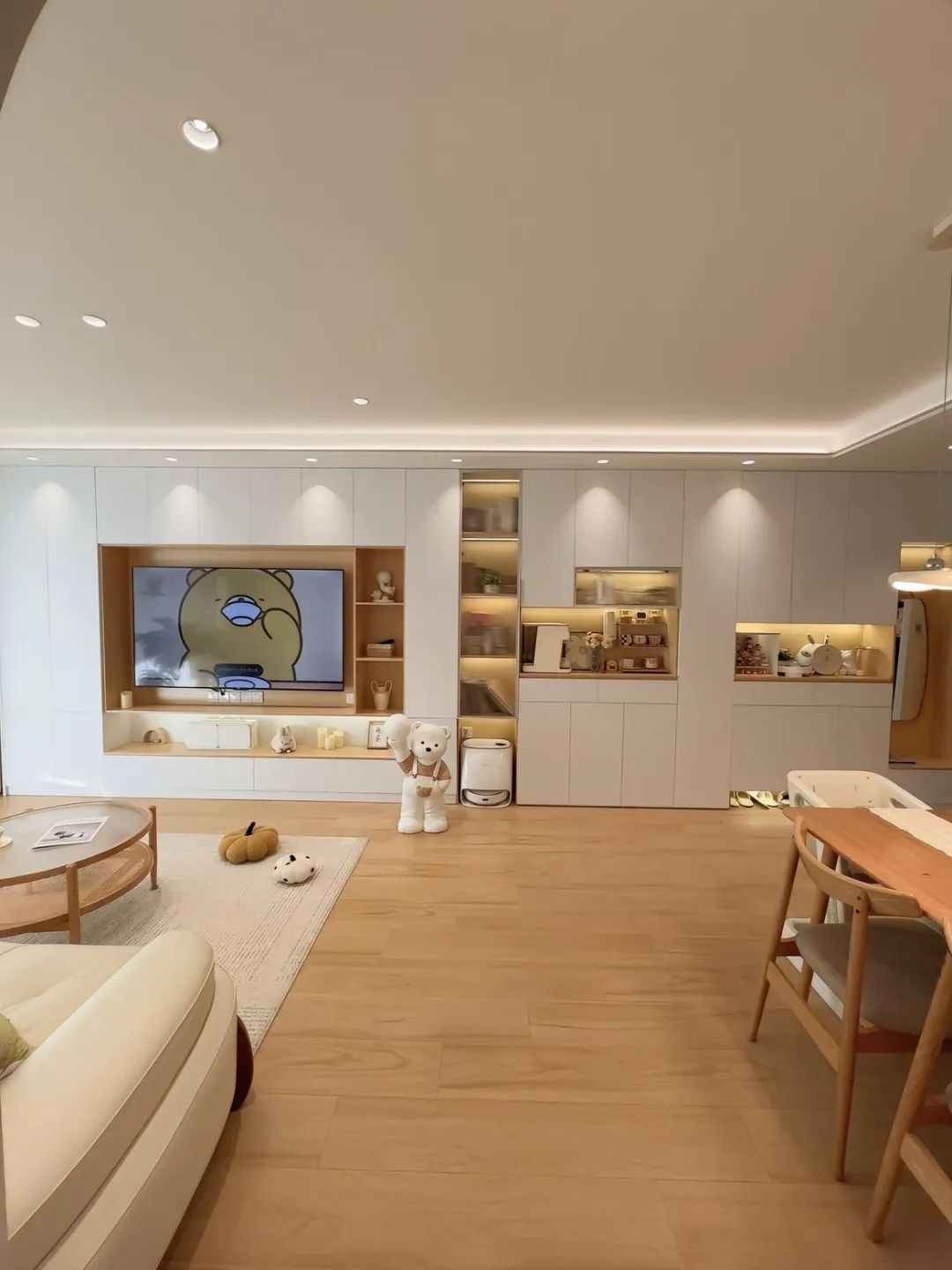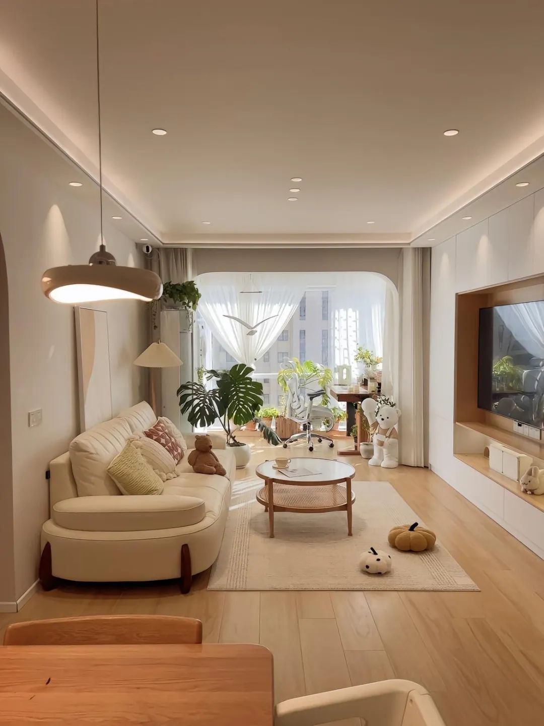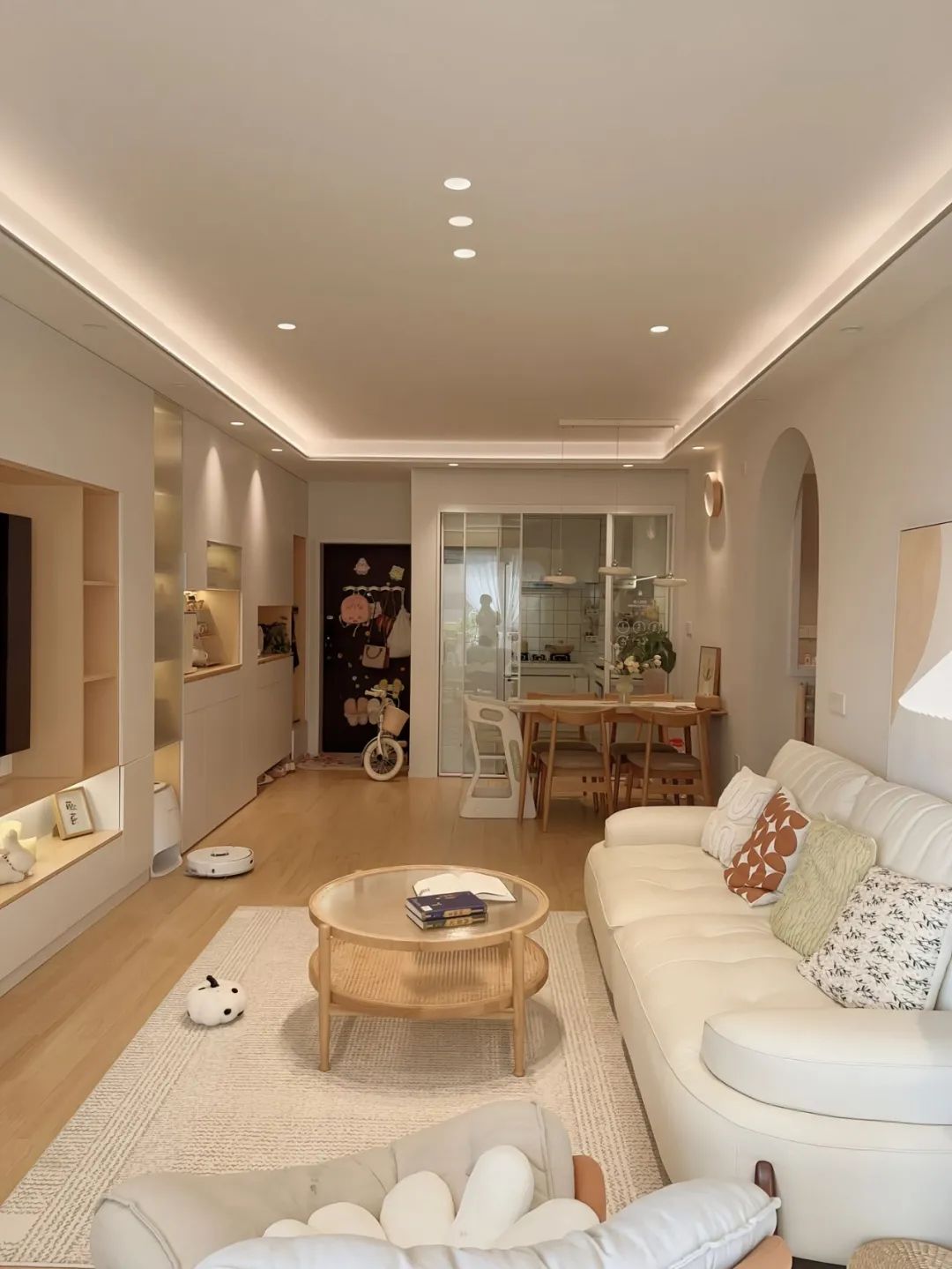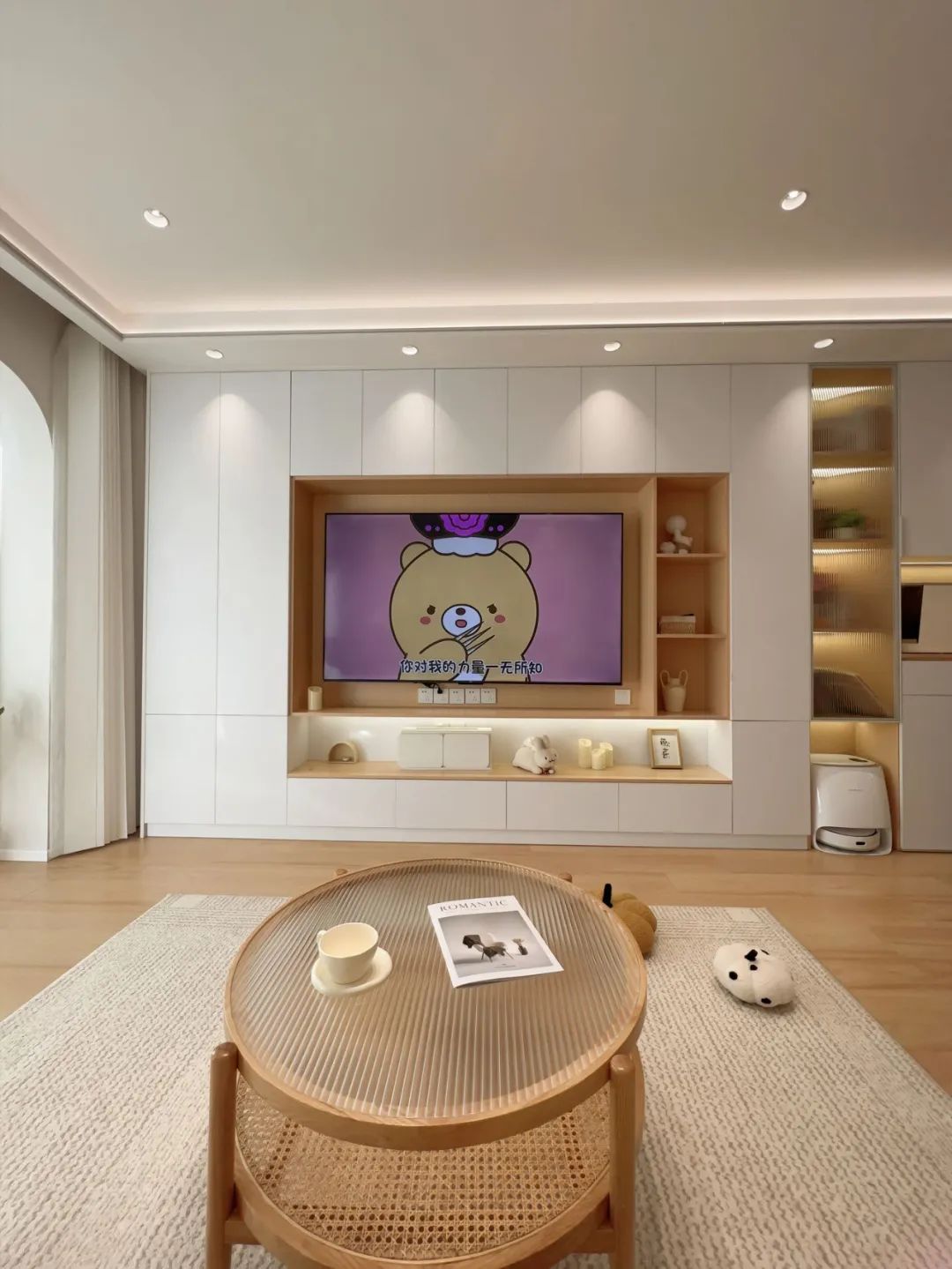客厅开间3.54米,打了满墙电视柜。无主灯设计,不做任何分格和造型,选择大直排沙发,扩大空间不占地。