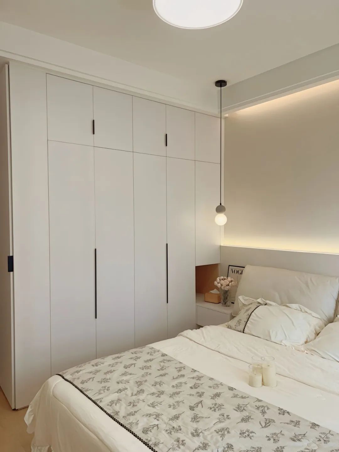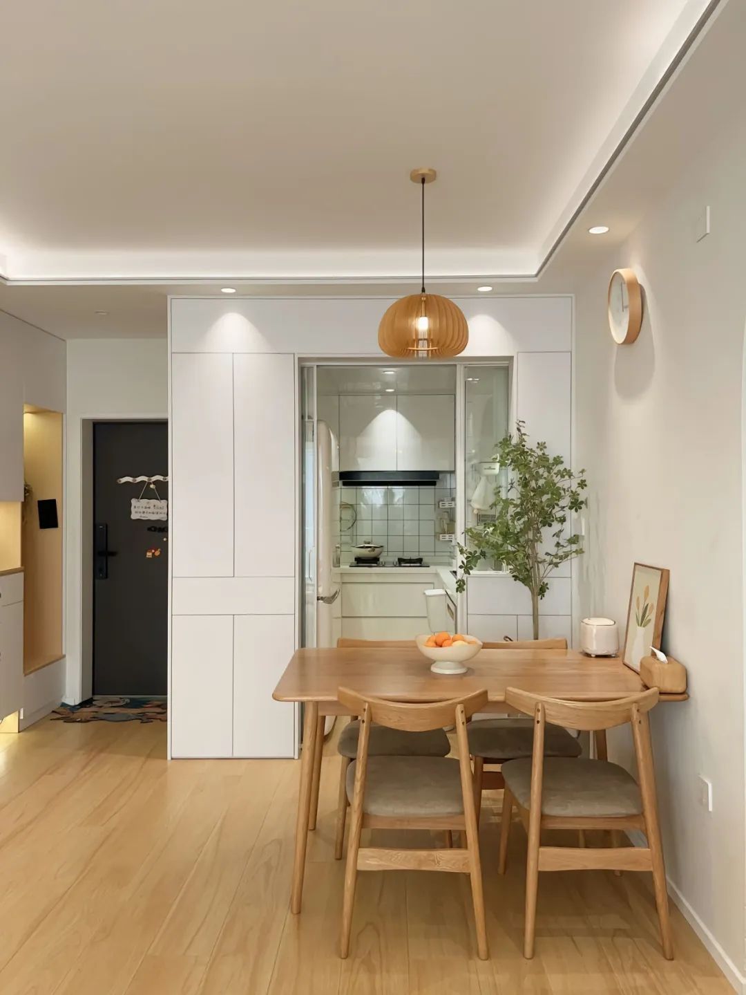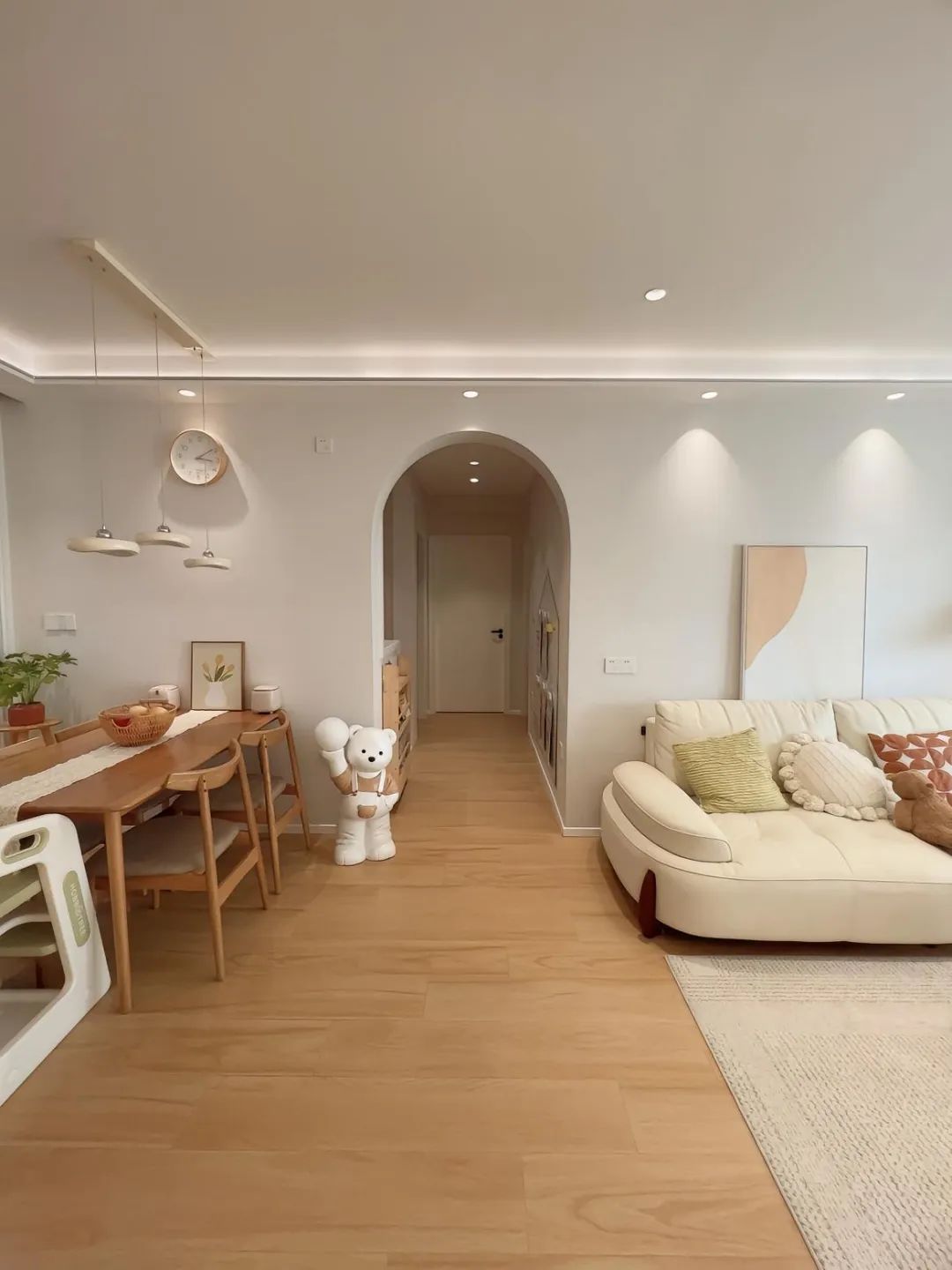 客厅开间3.54米,打了满墙电视柜。无主灯设计,不做任何分格和造型,选择大直排沙发,扩大空间不占地。
