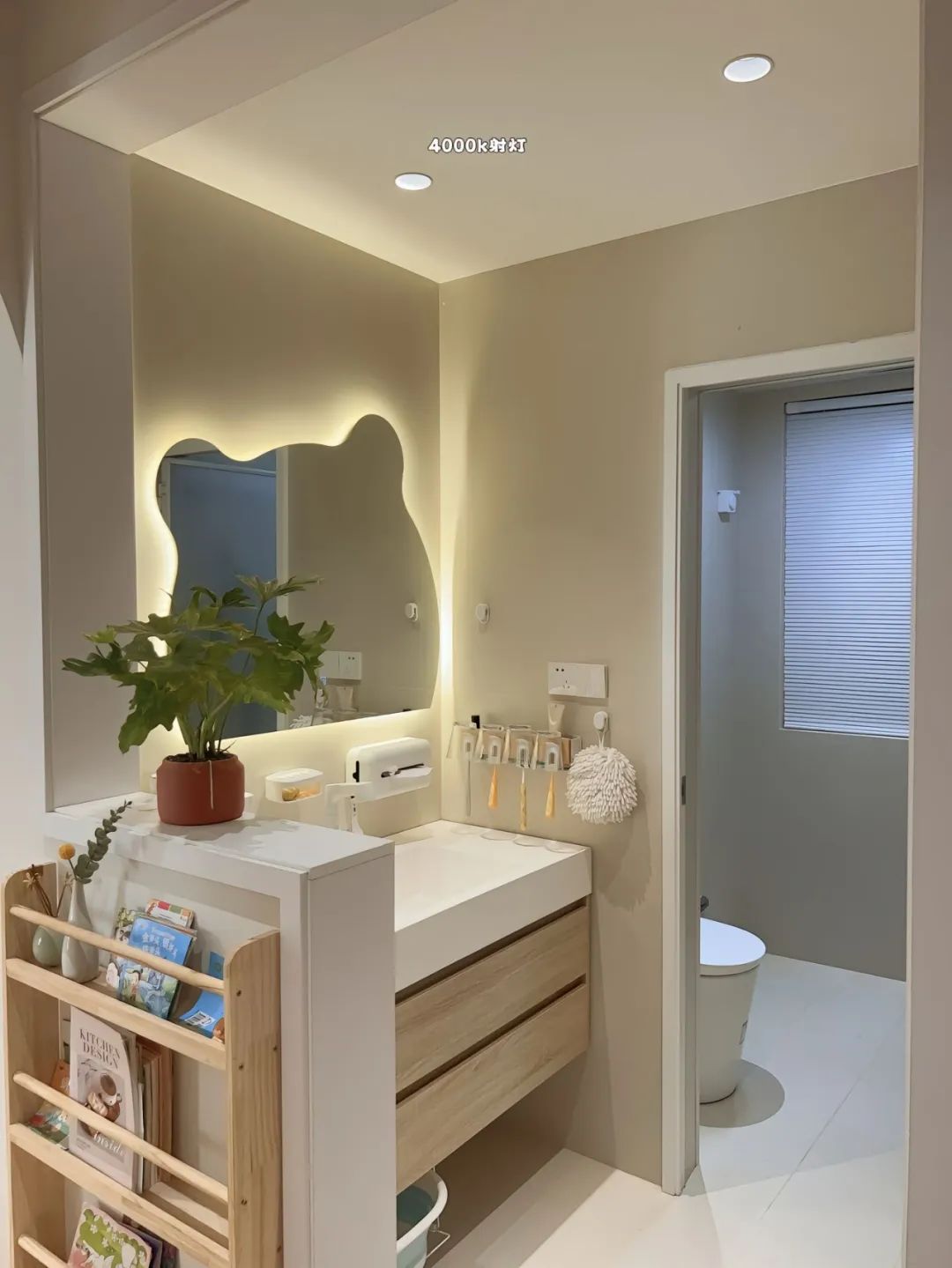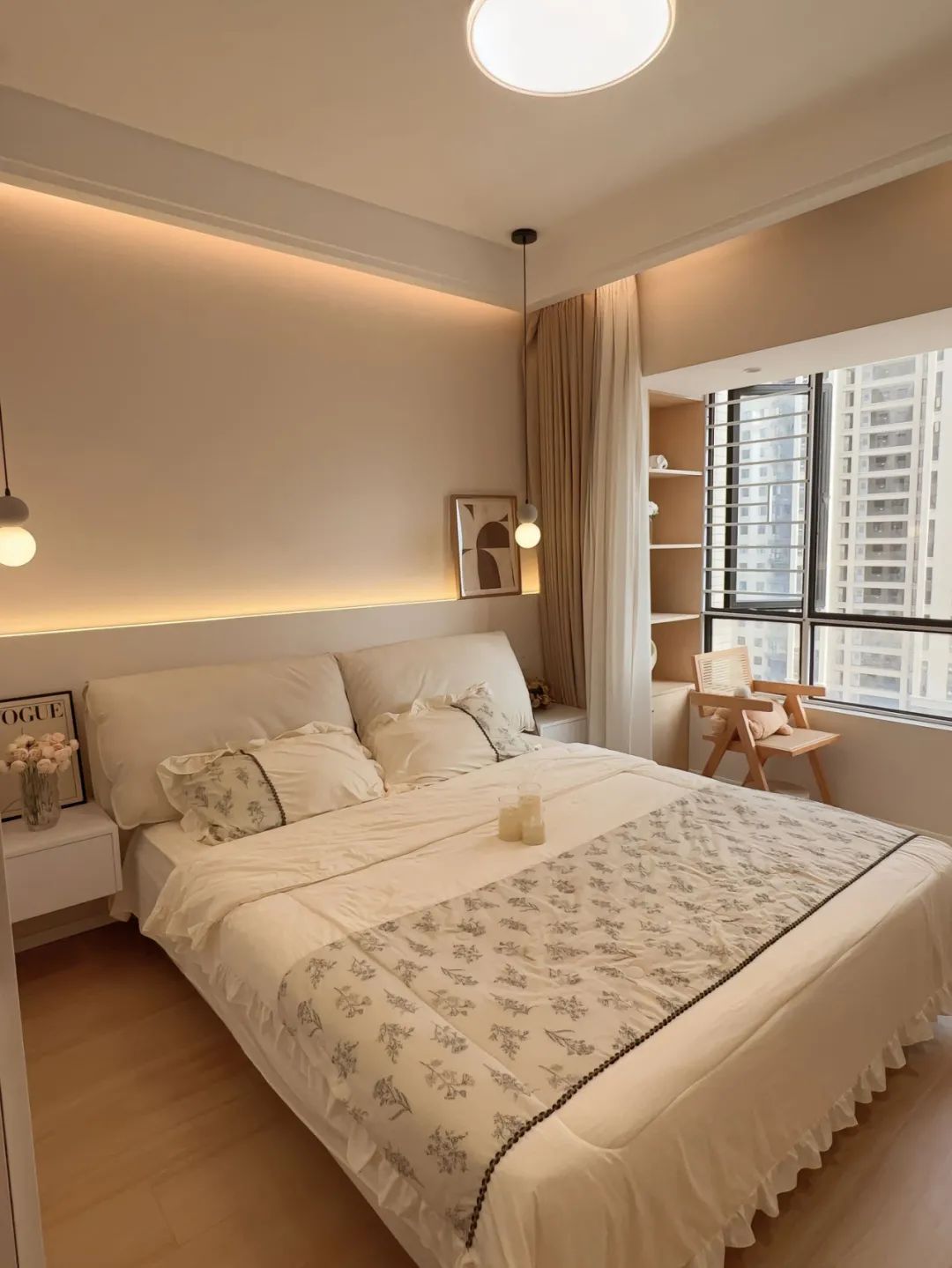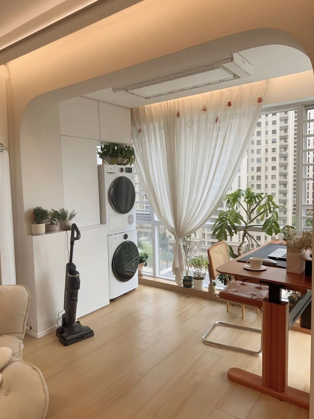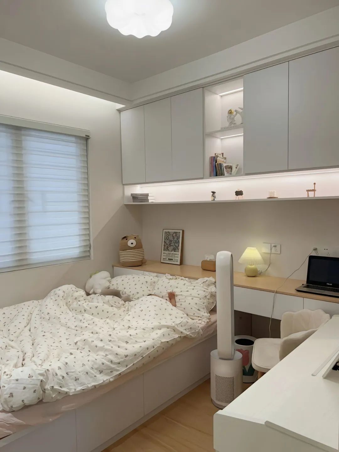 客厅开间3.54米,打了满墙电视柜。无主灯设计,不做任何分格和造型,选择大直排沙发,扩大空间不占地。
