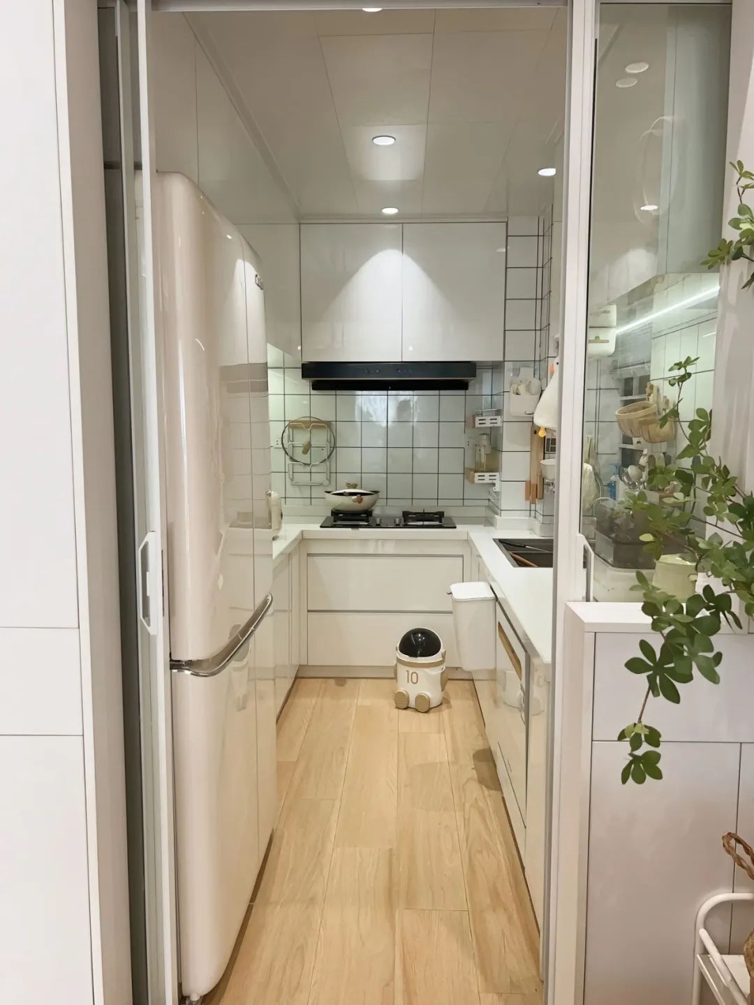 客厅通刷汝窑色乳胶漆,全屋通铺120✖20规格平面无纹理的木纹砖,搭配同色系环氧彩砂美缝,没有做过门石。