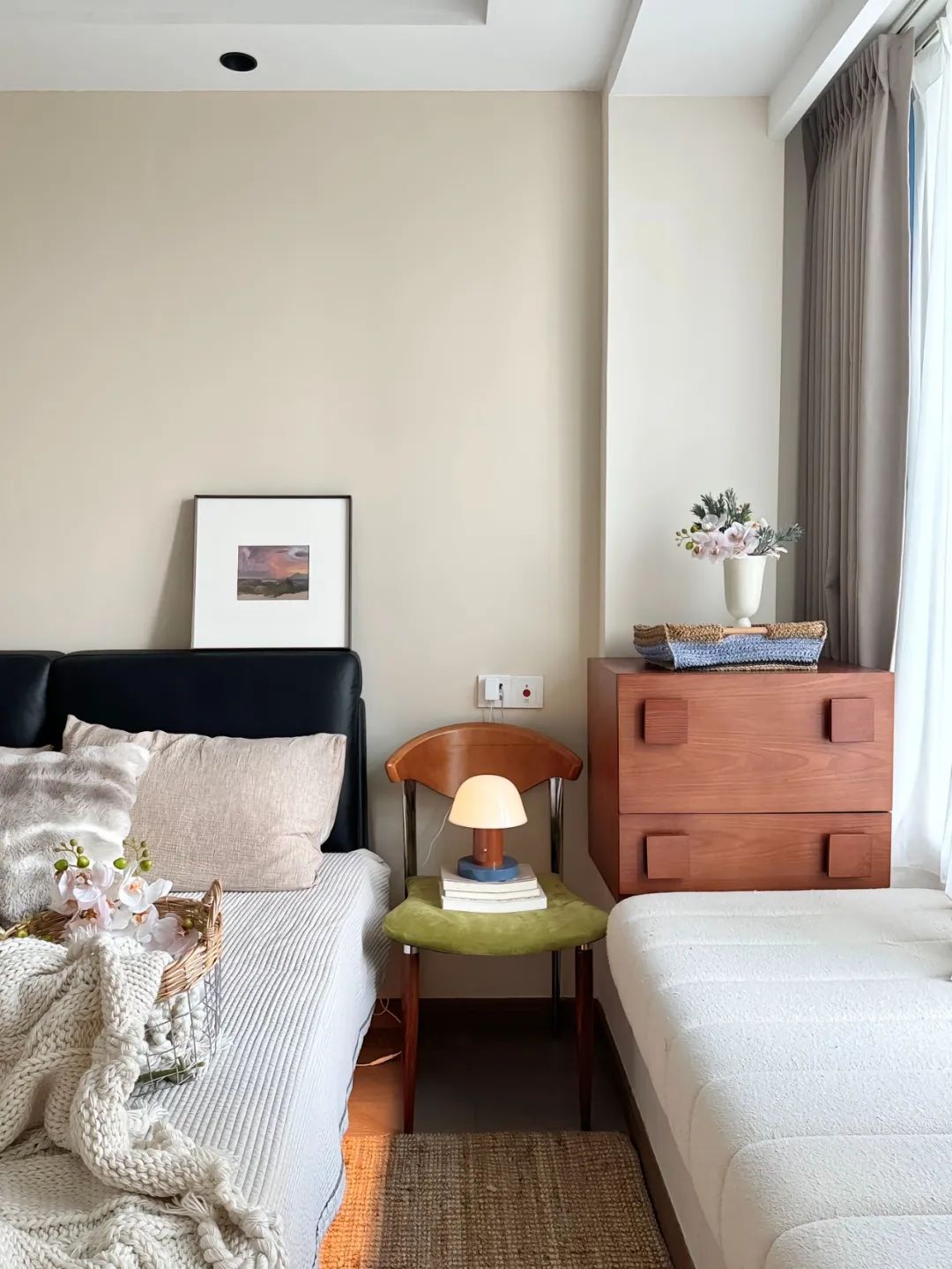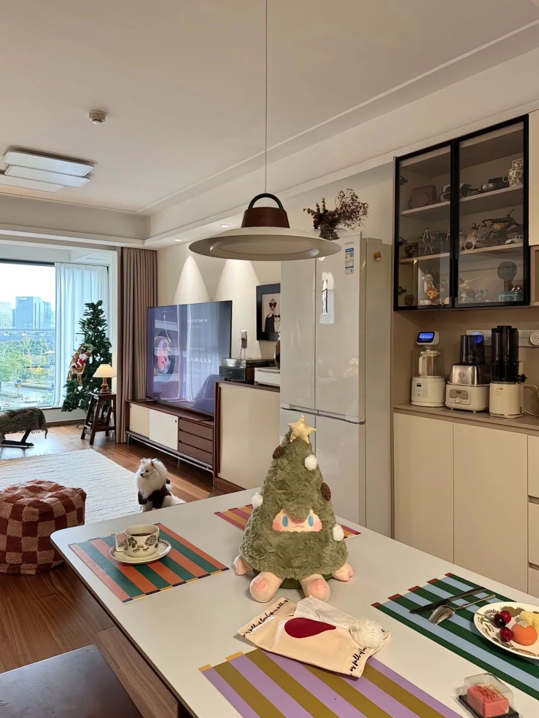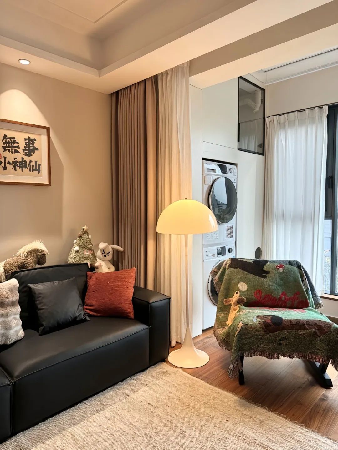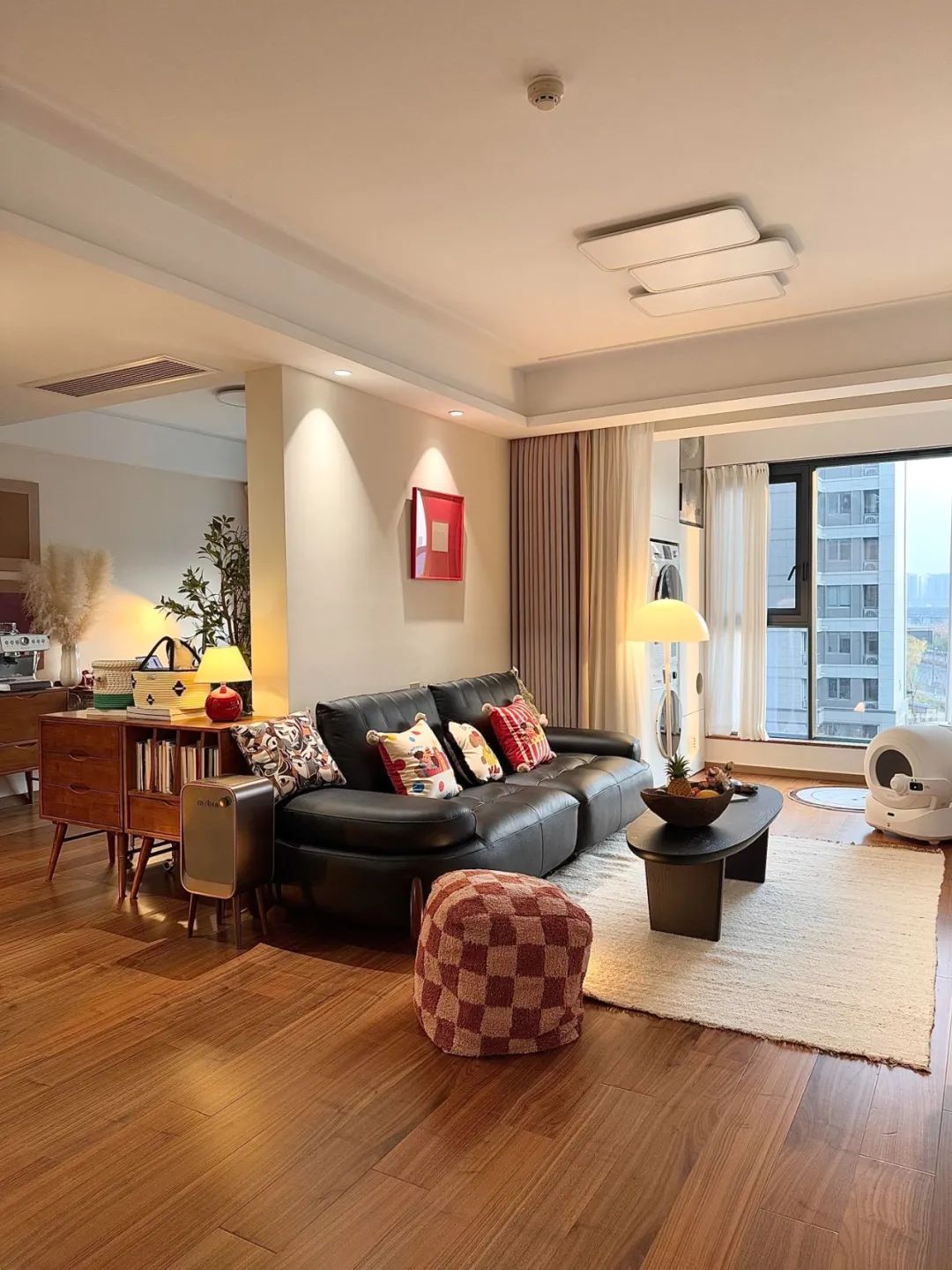 拆除了南次卧一部分墙体,开阔了客厅视野空间;拆除阳台推拉门,做上了一整面的落地窗