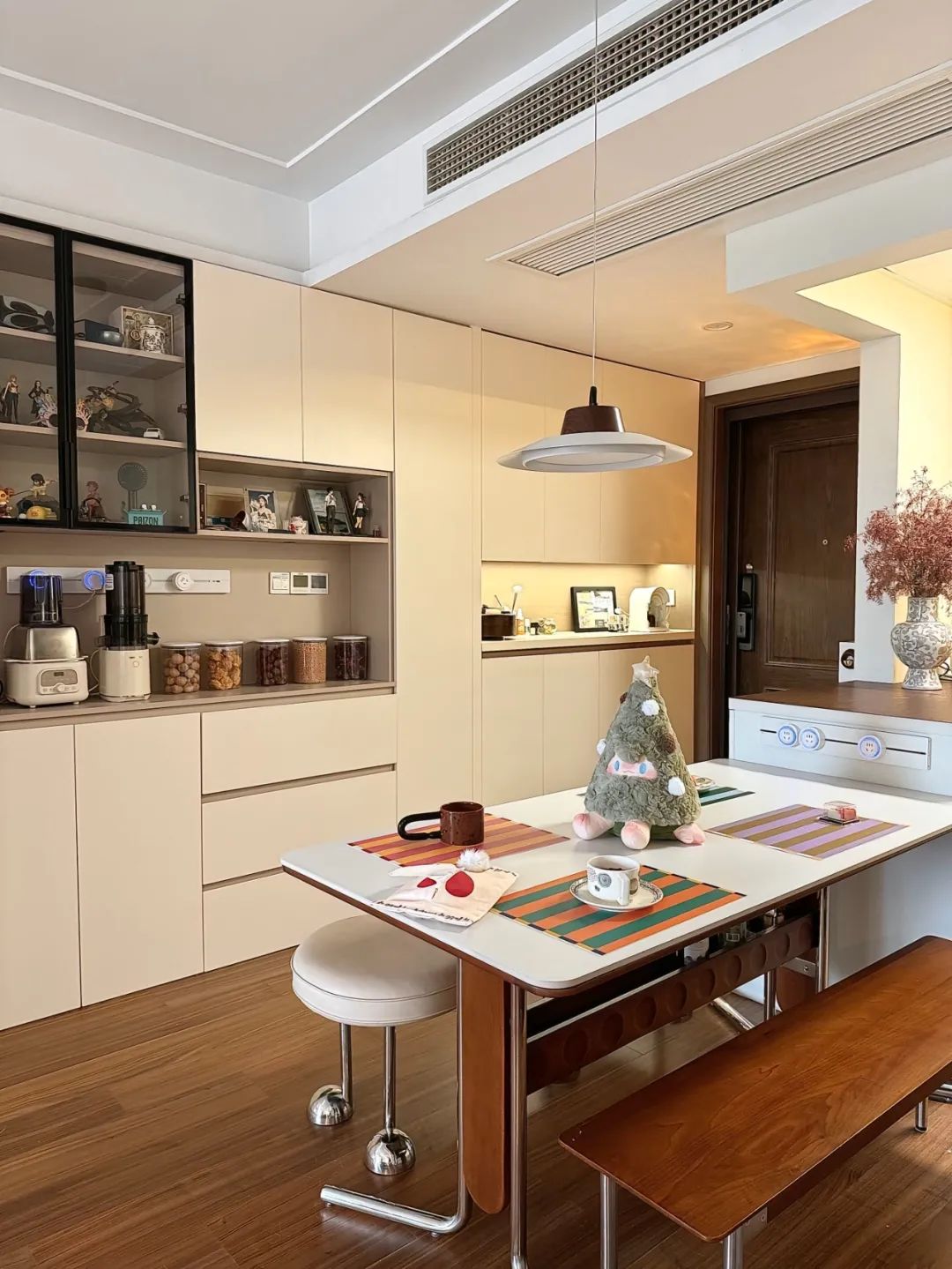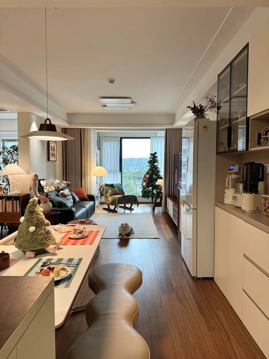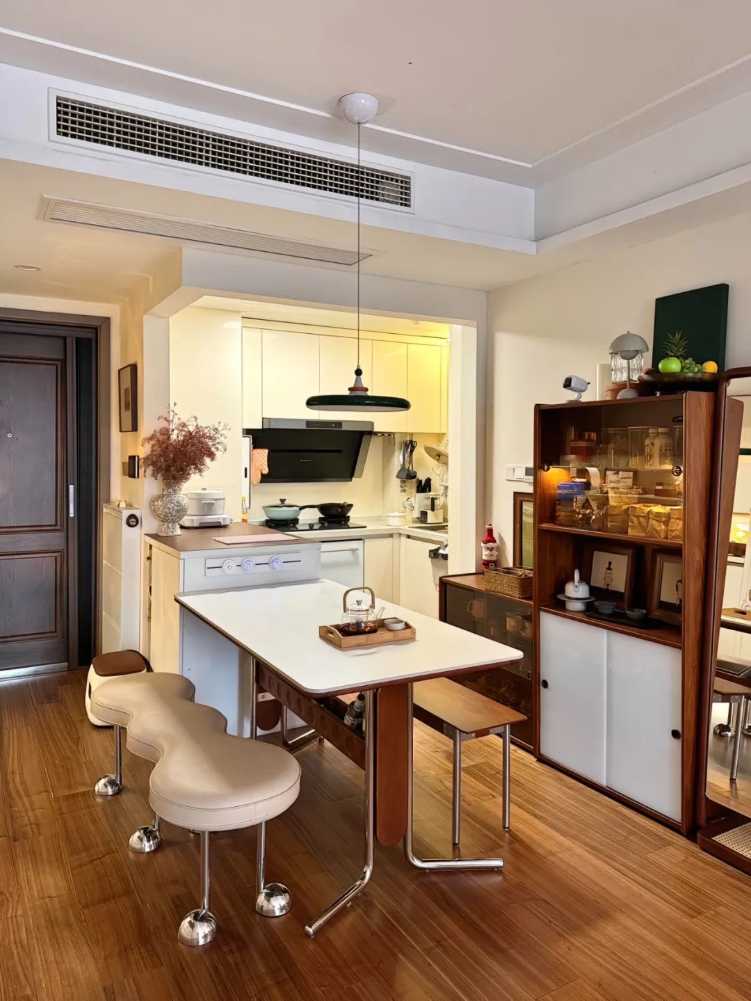 客餐厅一体的连廊中户,风格是胡桃木碰撞奶油风