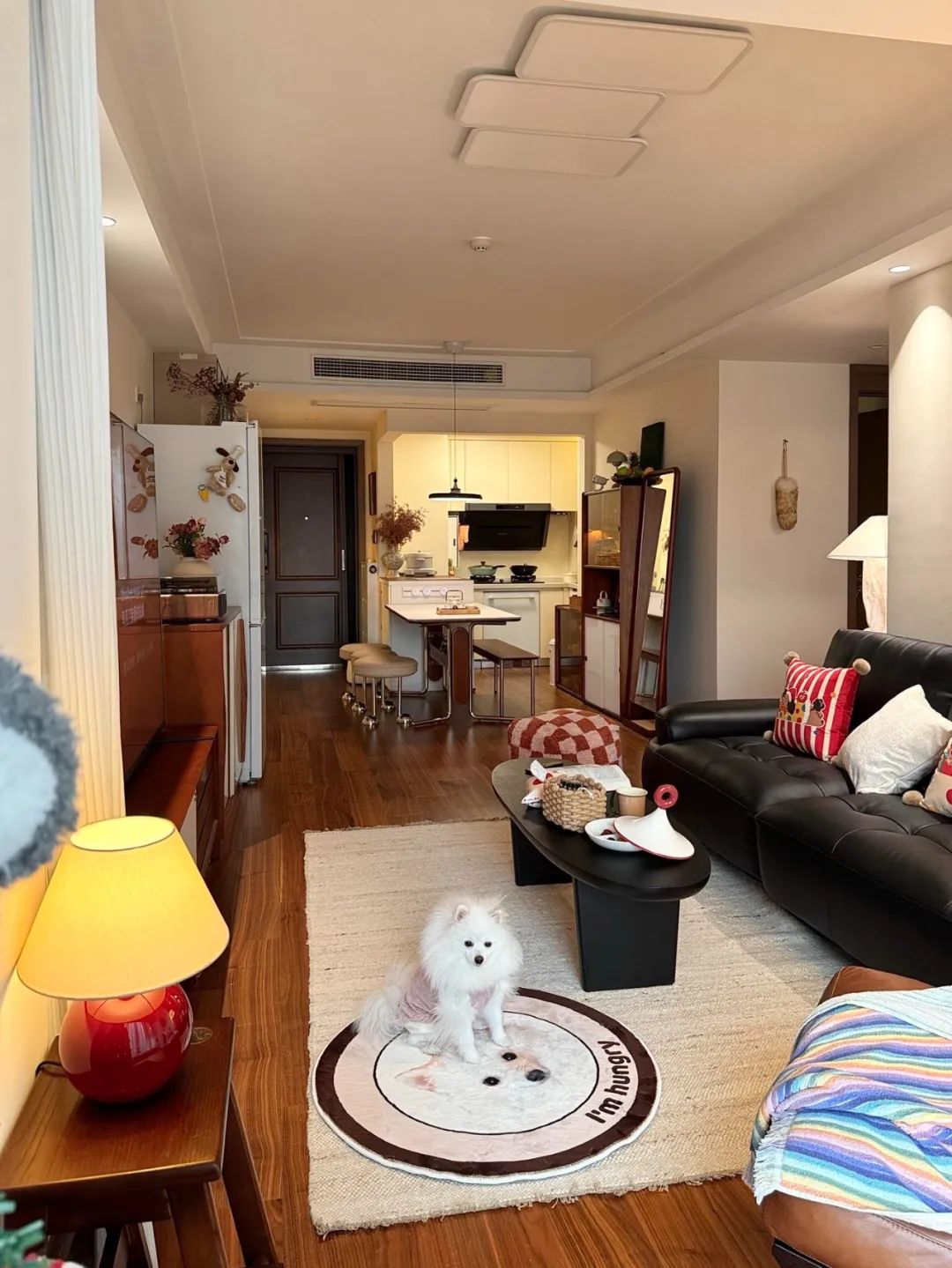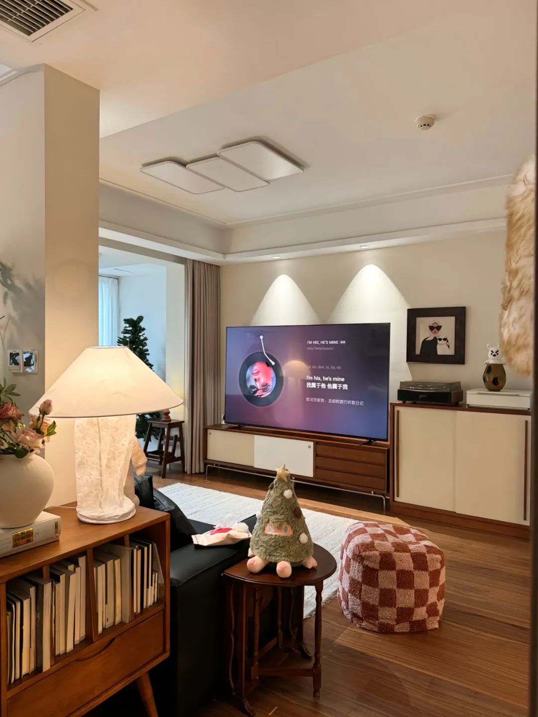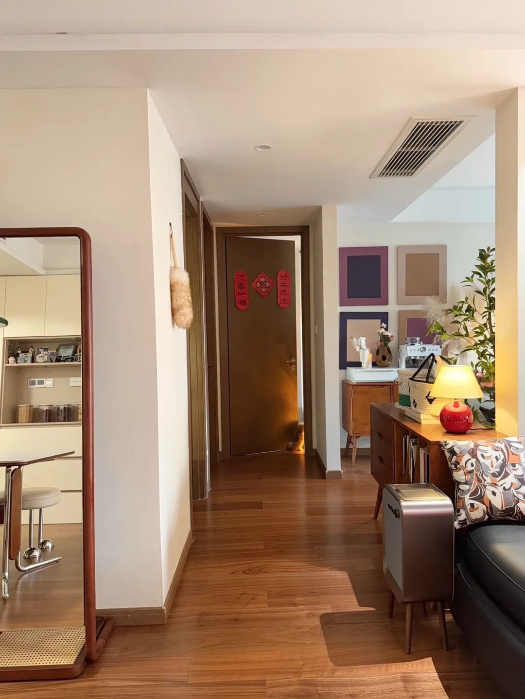 客餐厅一体的连廊中户,风格是胡桃木碰撞奶油风