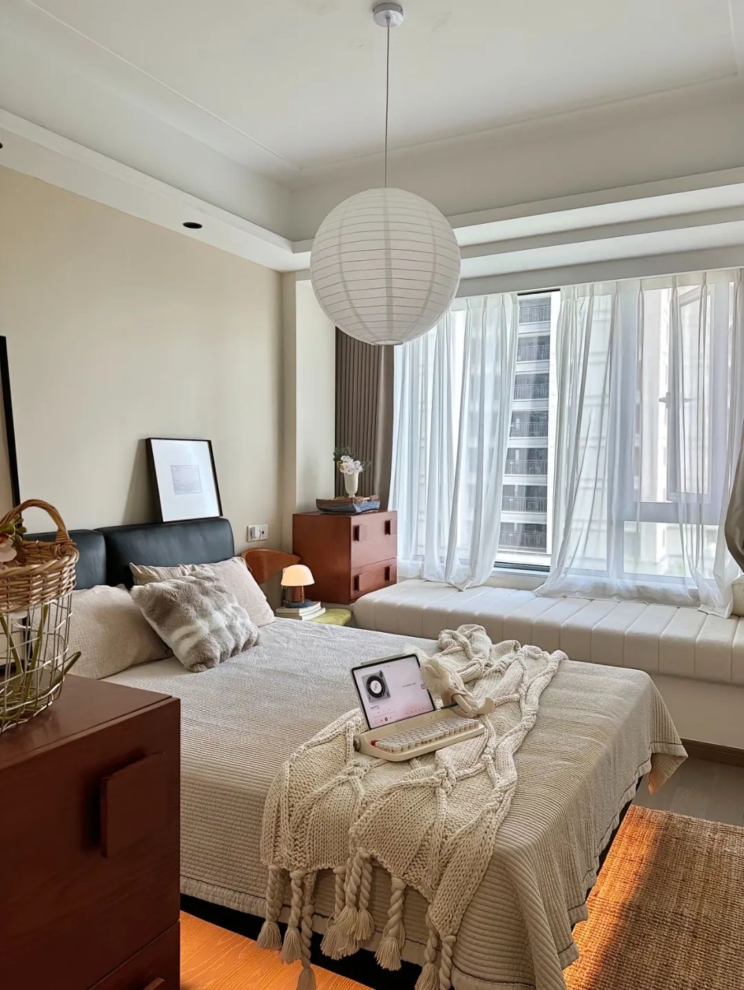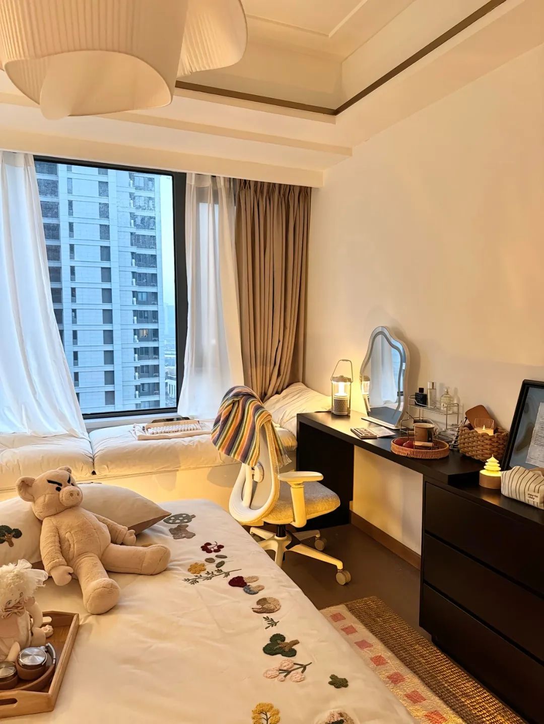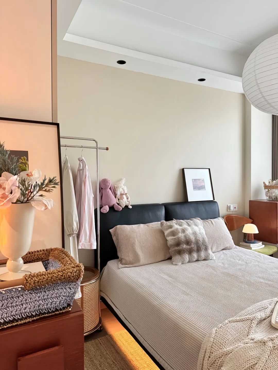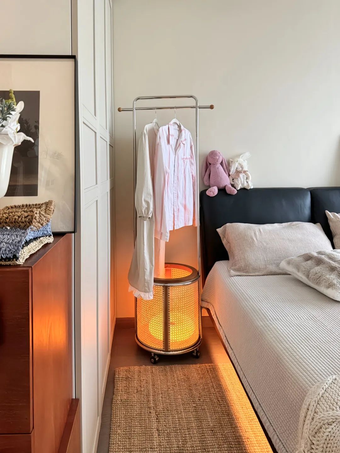 卧室添置了一个悬浮设计的床,从视觉上拉伸效果,空间显得很广阔;床边的暖黄色灯带更是把卧室显得温馨有氛围;衣柜选择白色简约大气的三列式衣柜;床头的简易衣架用来放置更换的居家衣物。