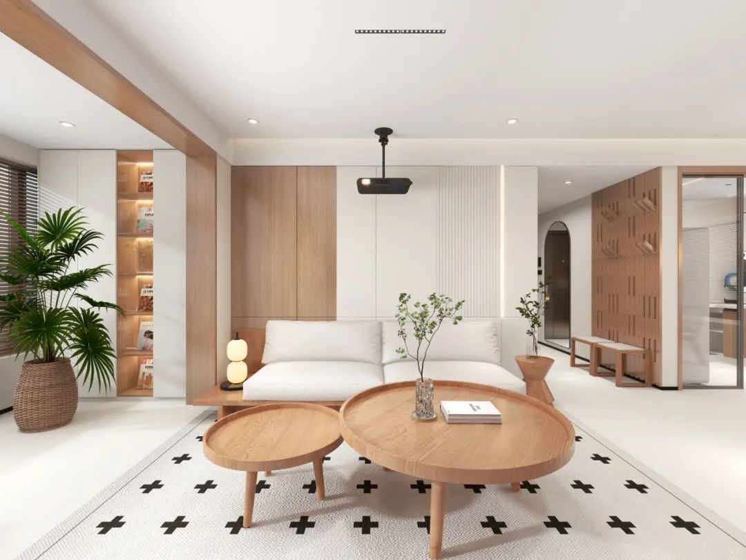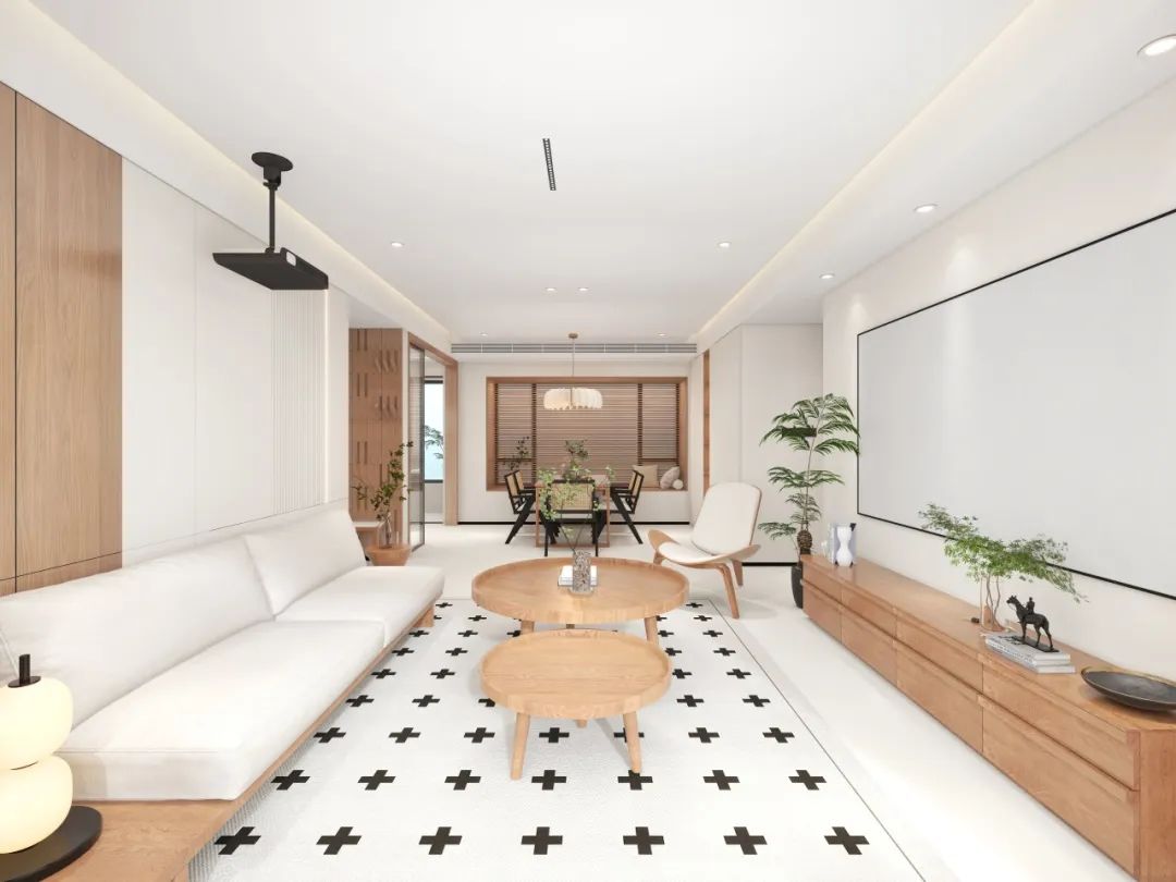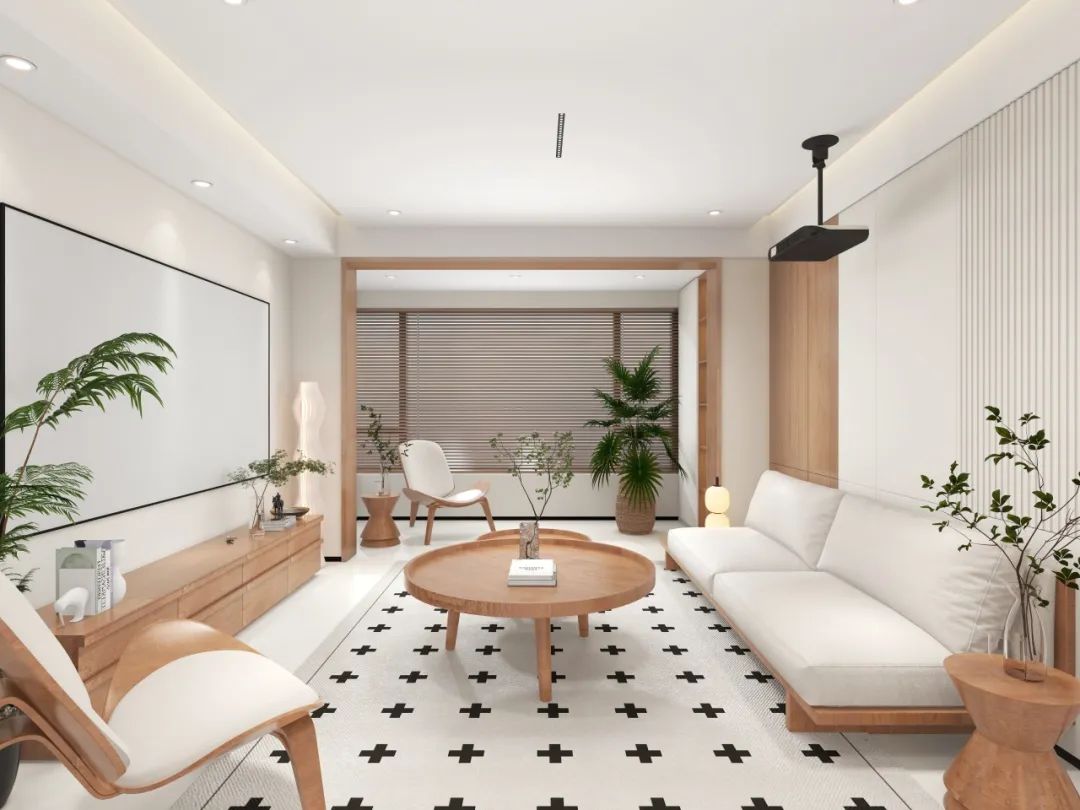 墙面采用原木色与白色护墙板拼接,木纹肌理与纯色块面形成视觉呼吸感,搭配极简边框投影幕布,让影音时光与艺术氛围并存