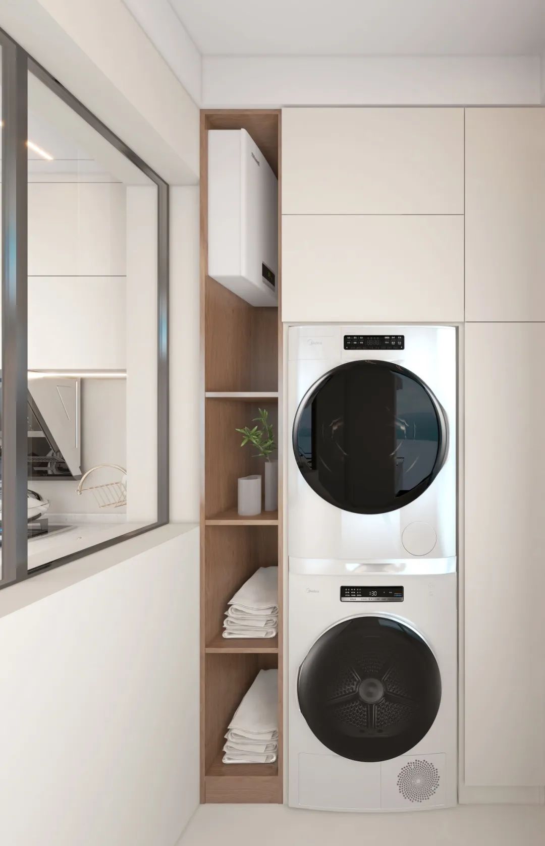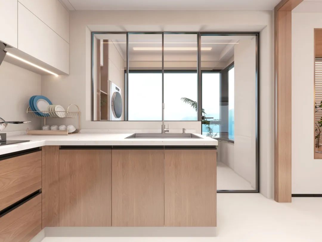 设计师更将生活阳台改造为家政专区,三联动玻璃门让洗衣区与厨房视觉贯通,晾晒收纳一气呵成。