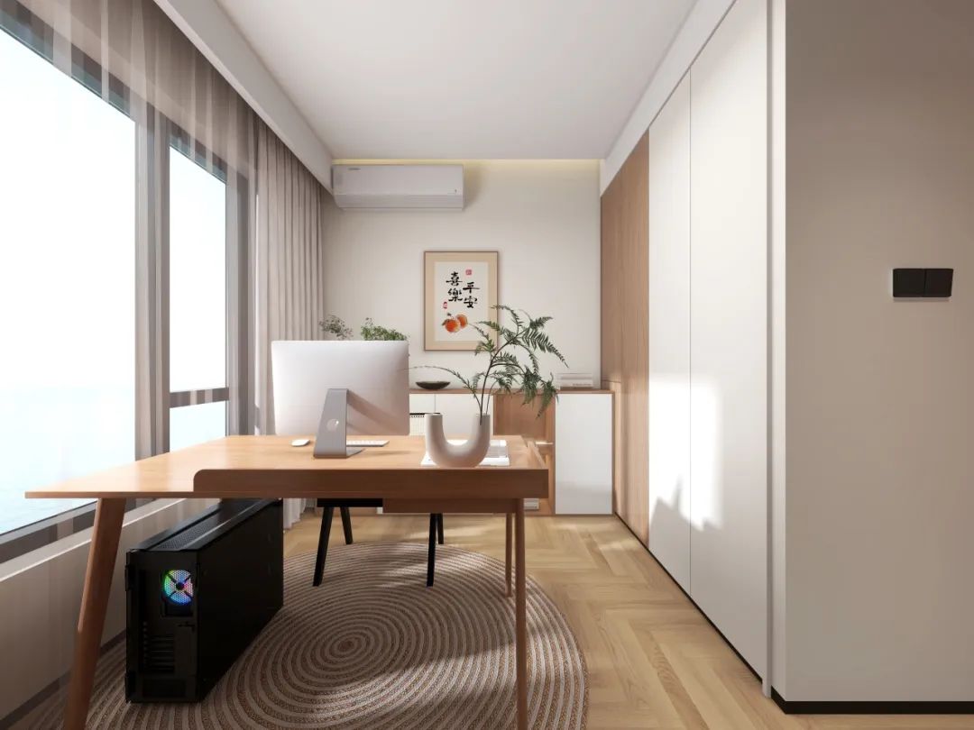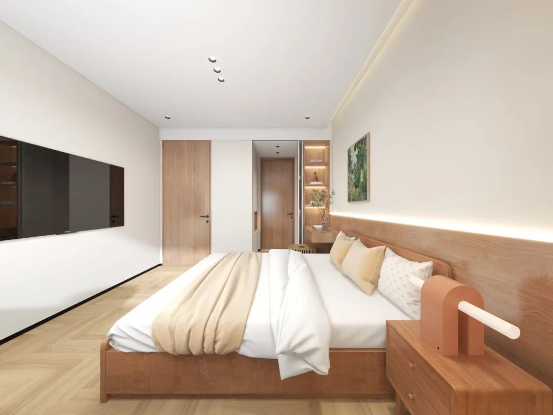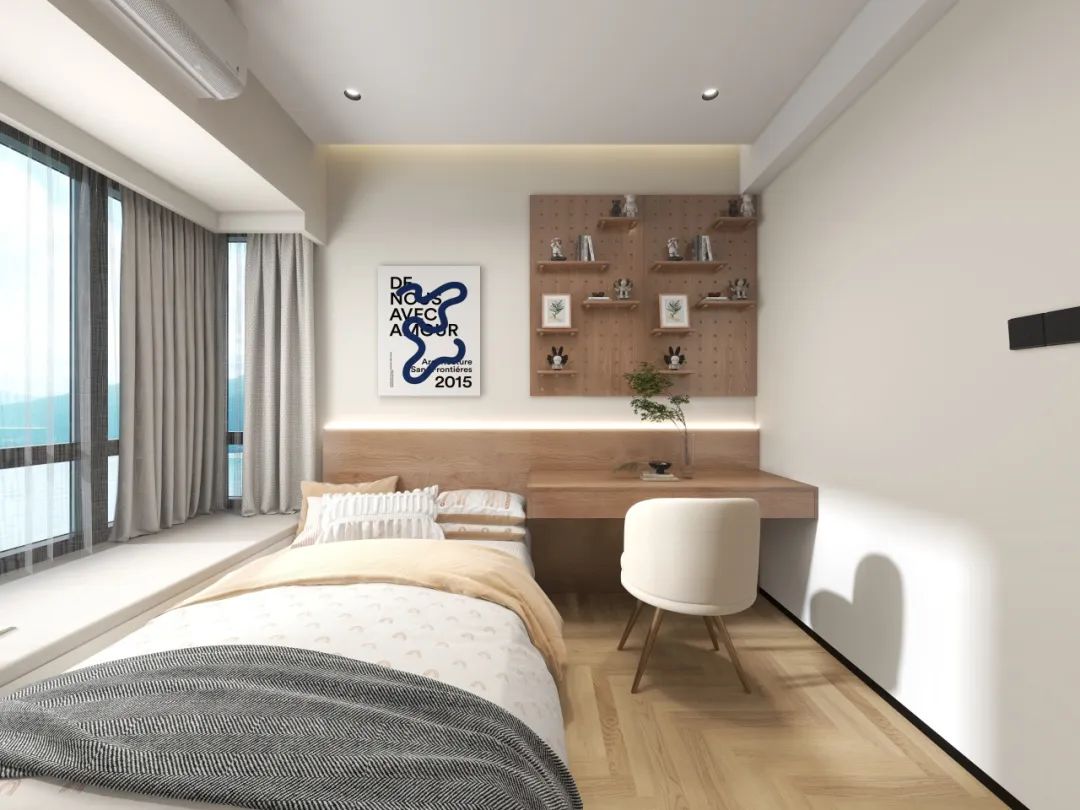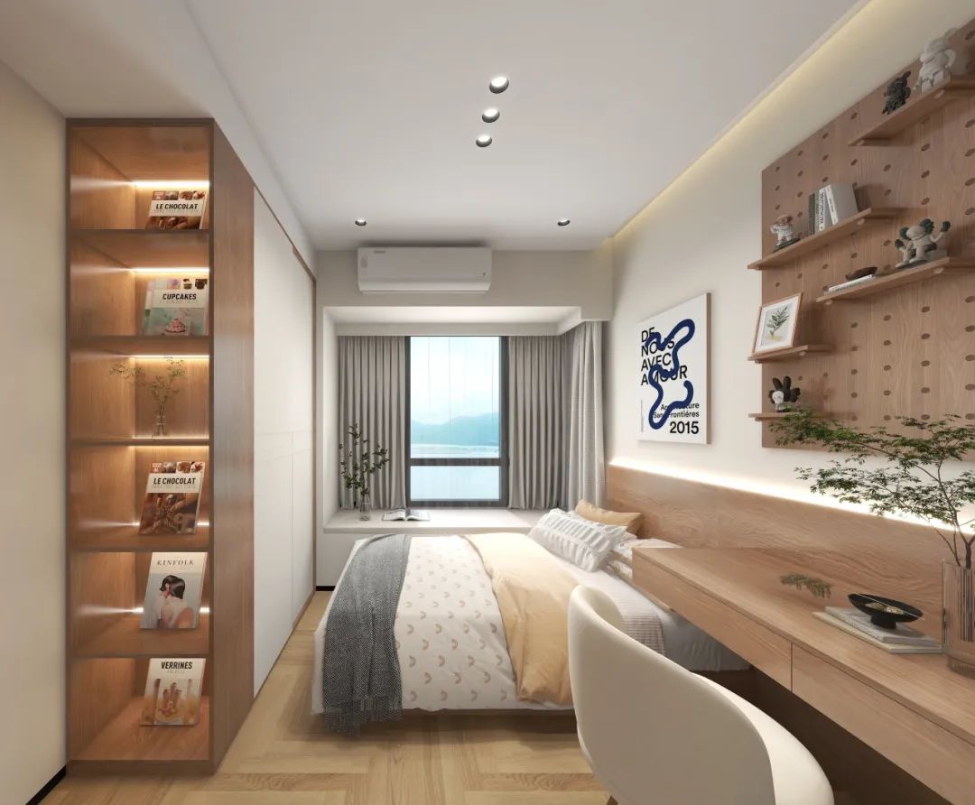 主卧突破传统布局,将飘窗延伸为悬浮书桌,内嵌式书架与侧墙通顶衣柜形成收纳矩阵,书籍、衣物各归其位