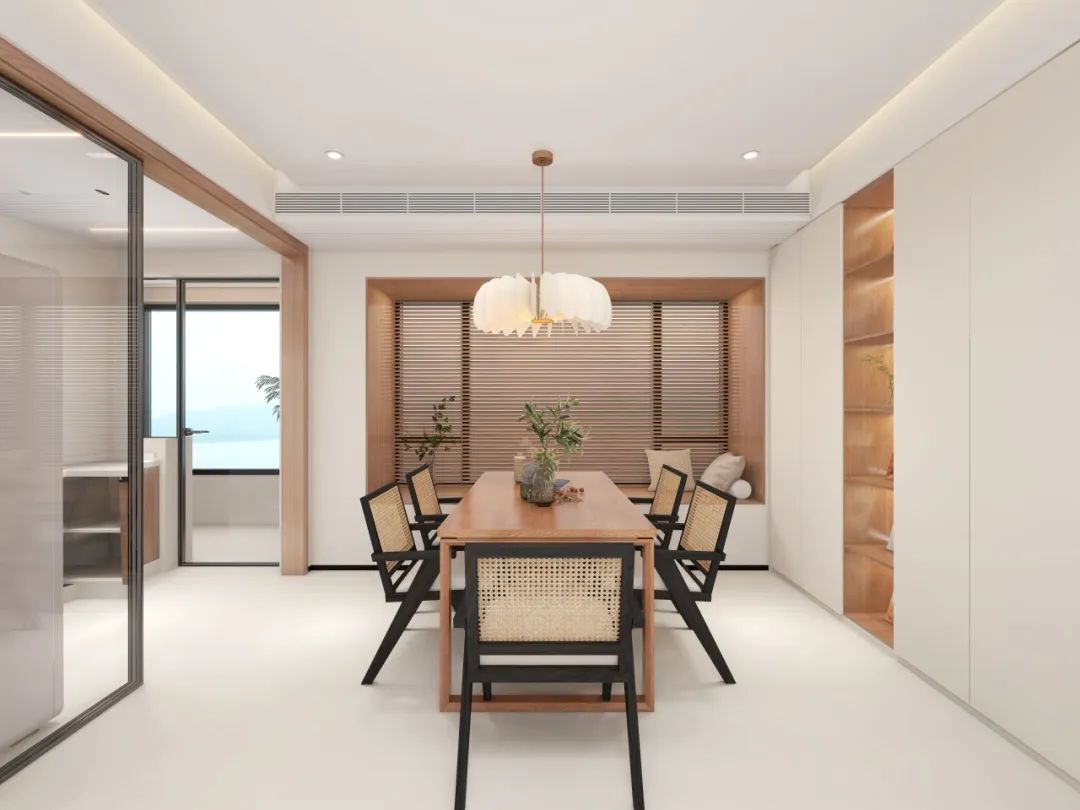 设计师打破传统隔墙思维,用三联动透明玻璃门串联厨房与餐厅,引光入室的通透感让5人位原木方桌更显开阔。