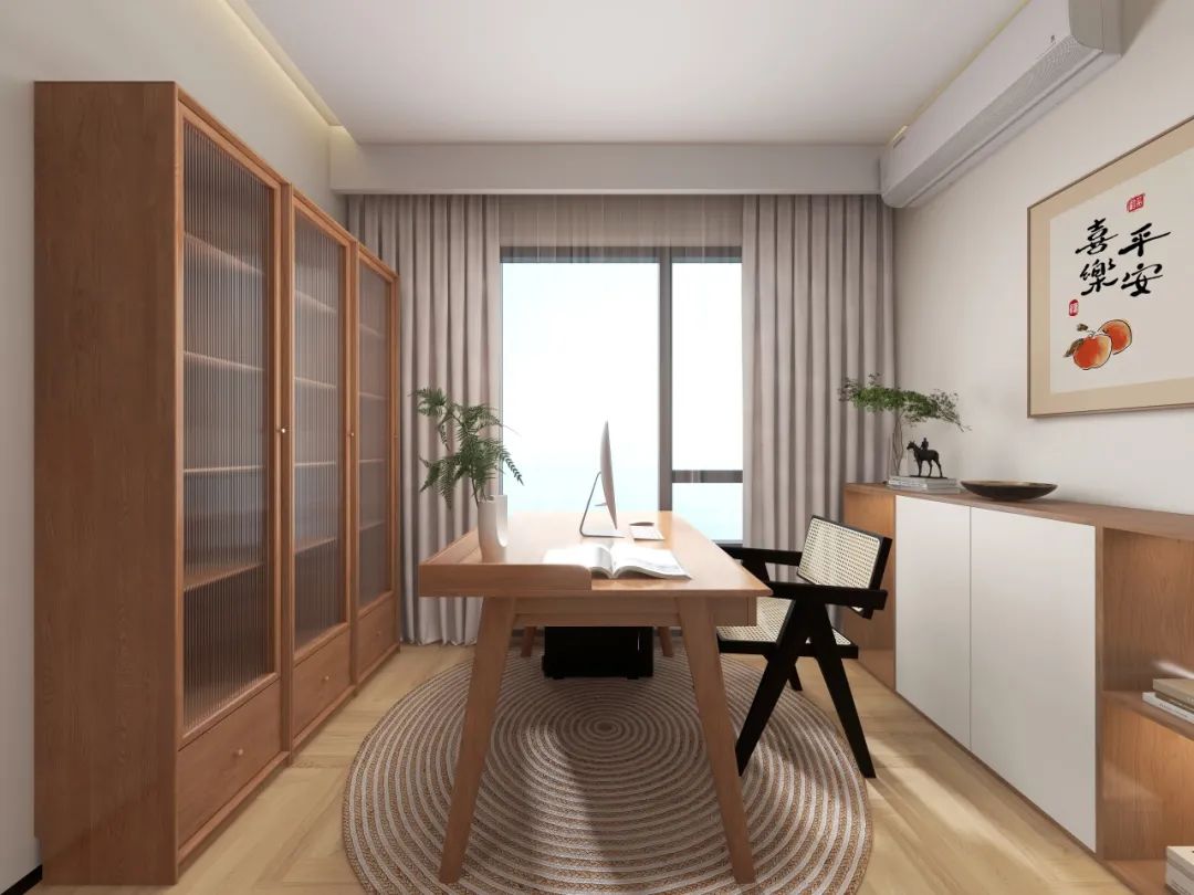 进门左手打造的独立书房,用满墙柜体实现「收纳自由」,成品玻璃书柜防尘显质感,与定制柜体虚实相生。