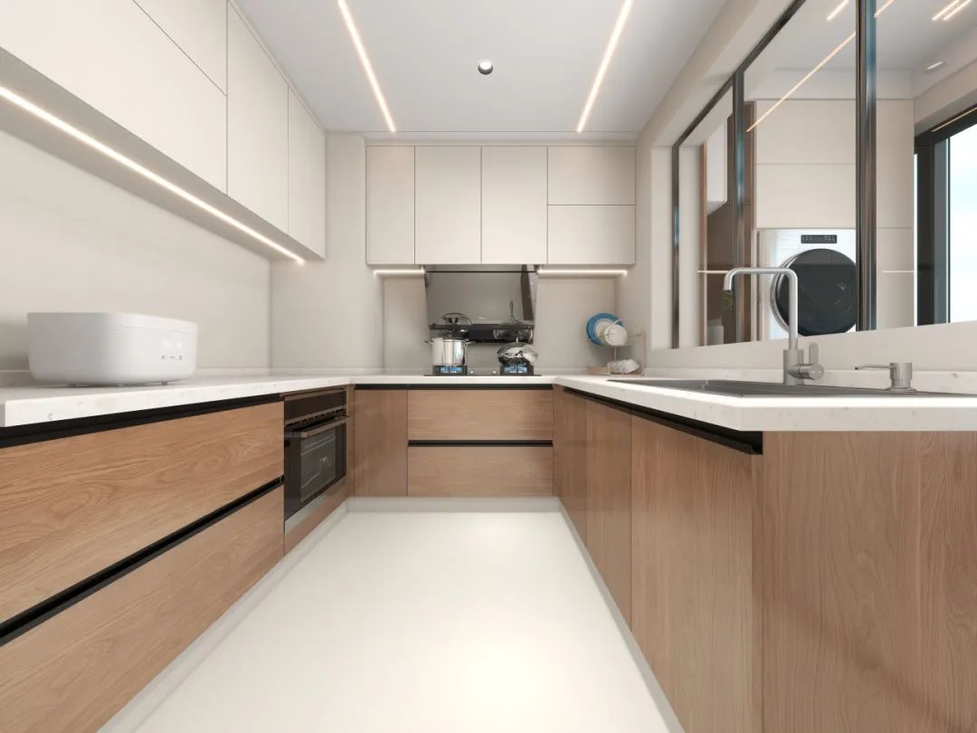 白色吊柜与原木地柜的「上下分色」设计,让L型厨房瞬间拥有立体层次。