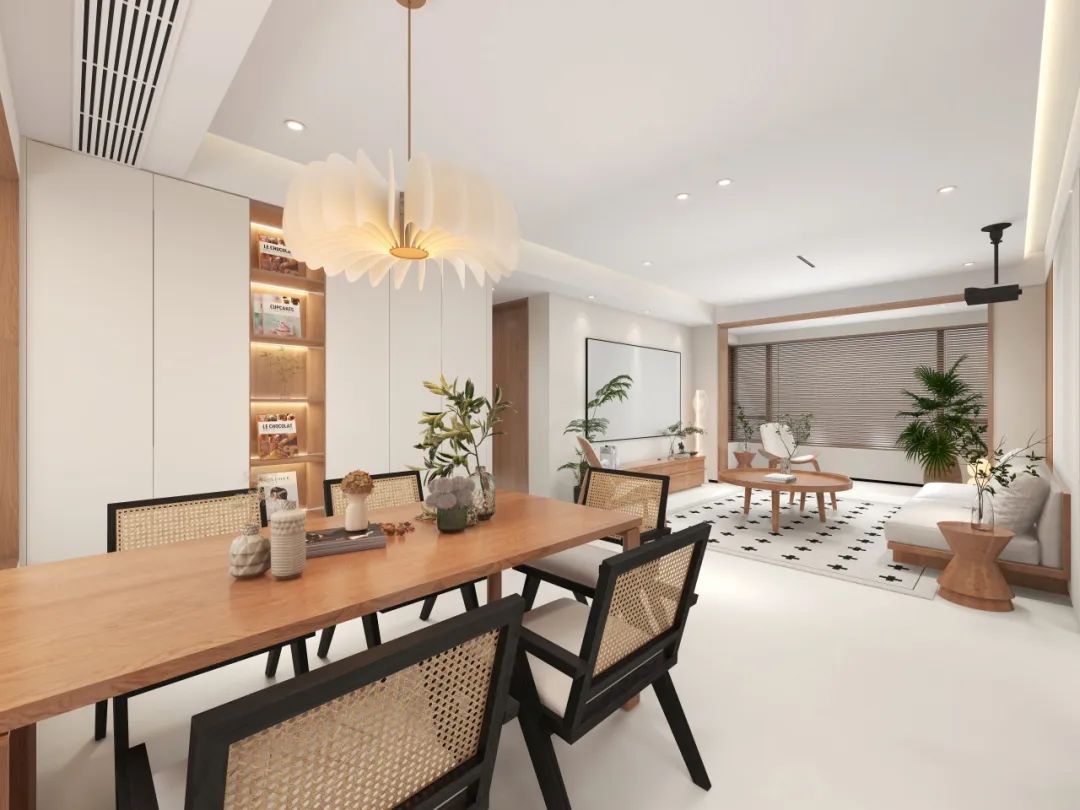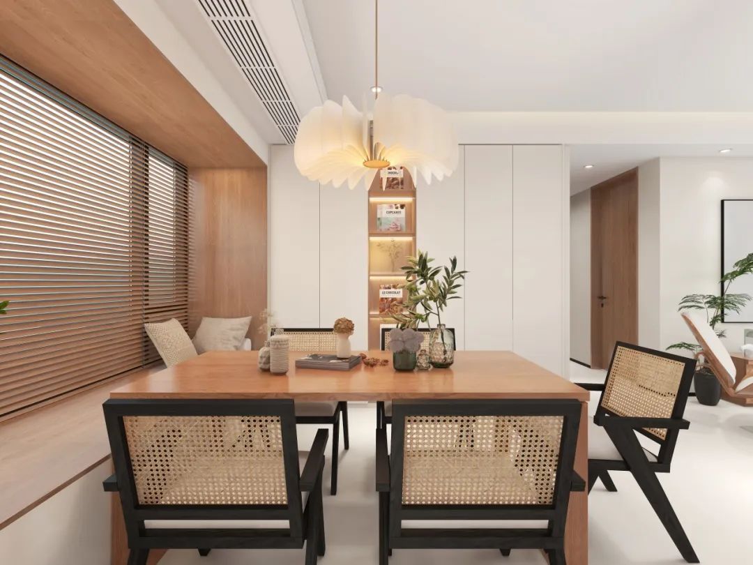 黑色藤编椅以轻盈体态中和实木厚重感,餐桌上方垂坠的创意羽毛吊灯,用灵动的曲线为空间注入轻奢呼吸感。
