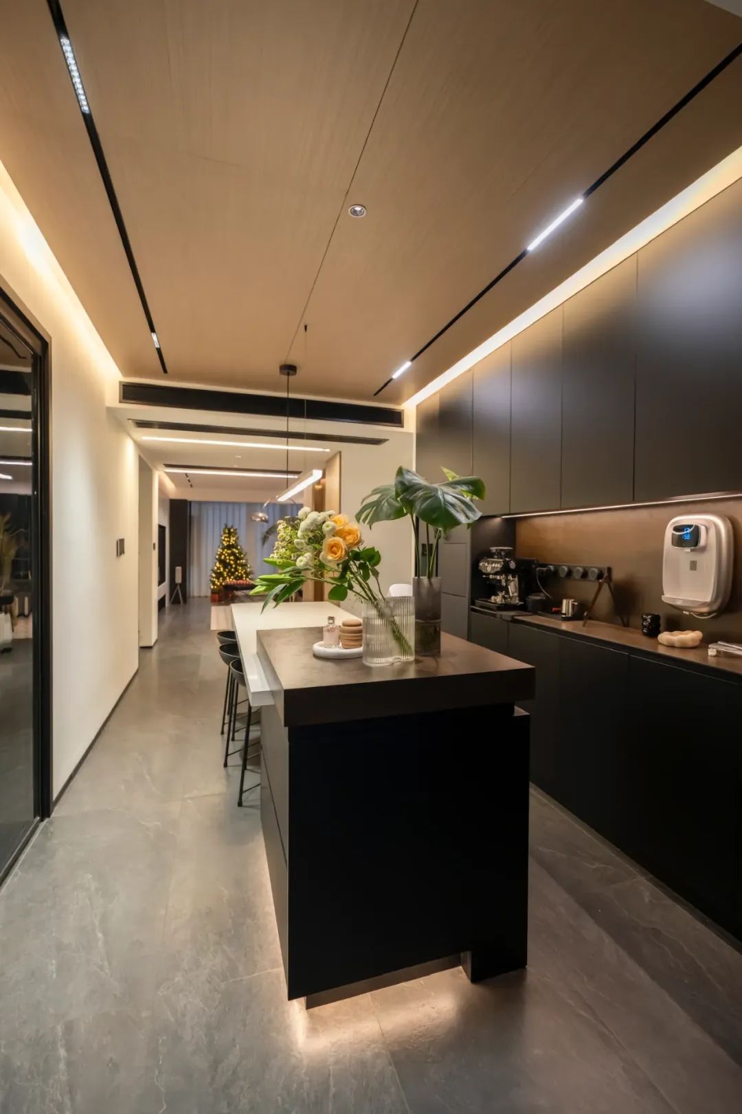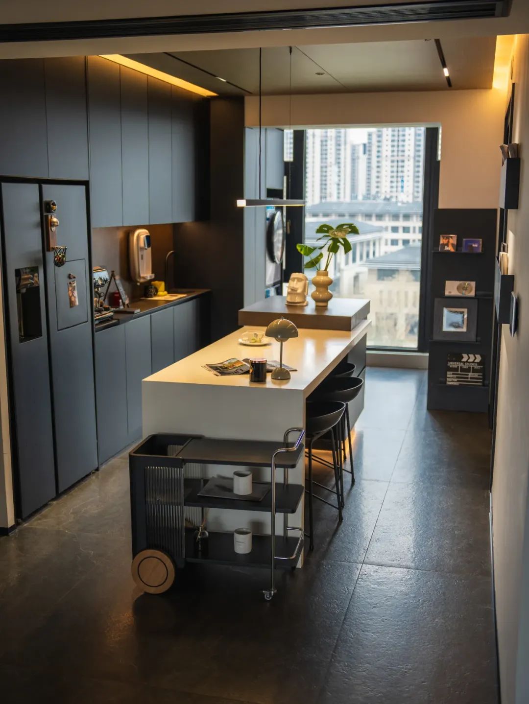 1.4m 长的一字灯高悬,餐桌上方的吊灯作为主灯,散发着柔和的光芒,而岛台上方的射灯与两侧灯带,则精准地照亮每一处需要的角落。