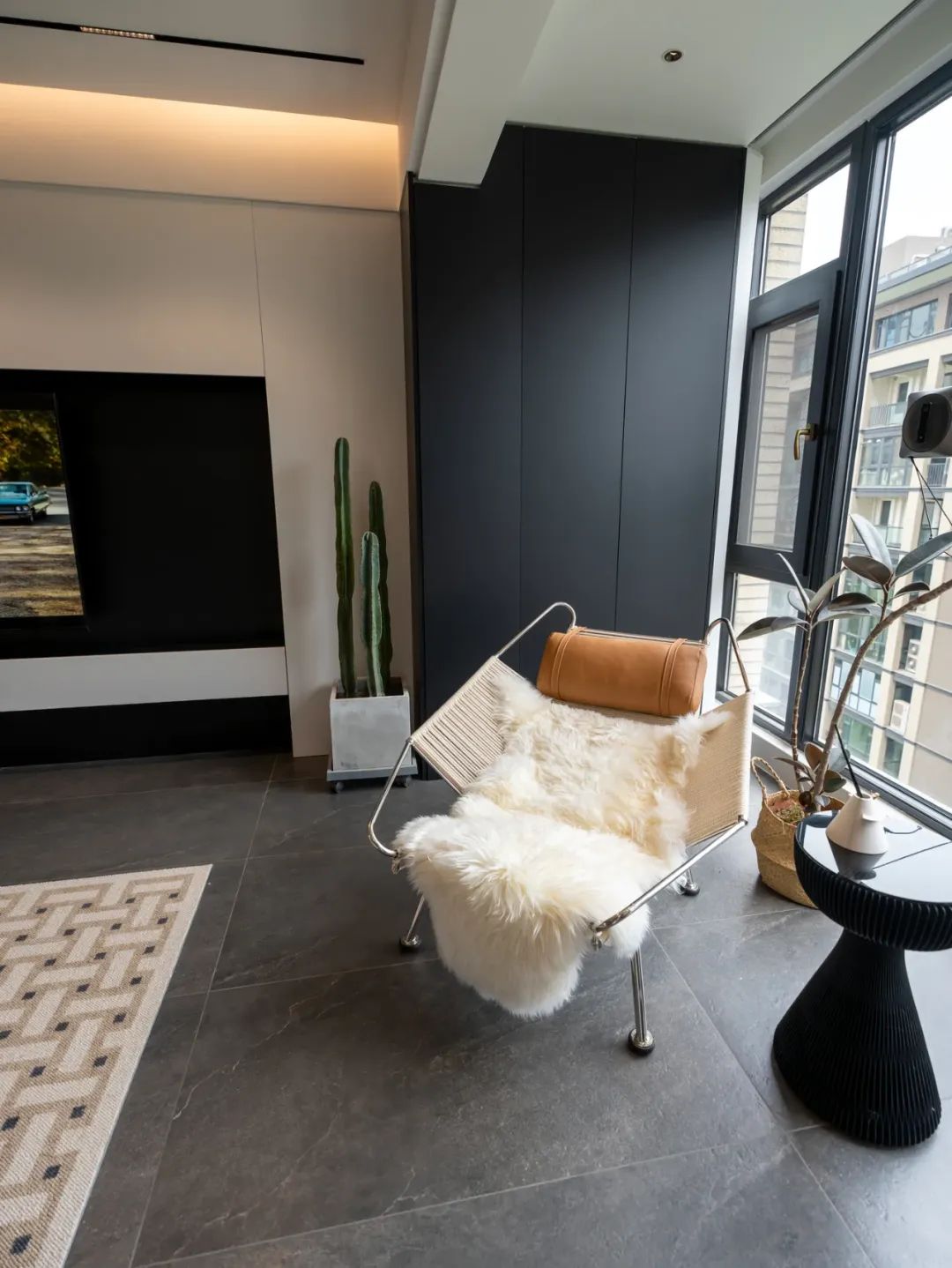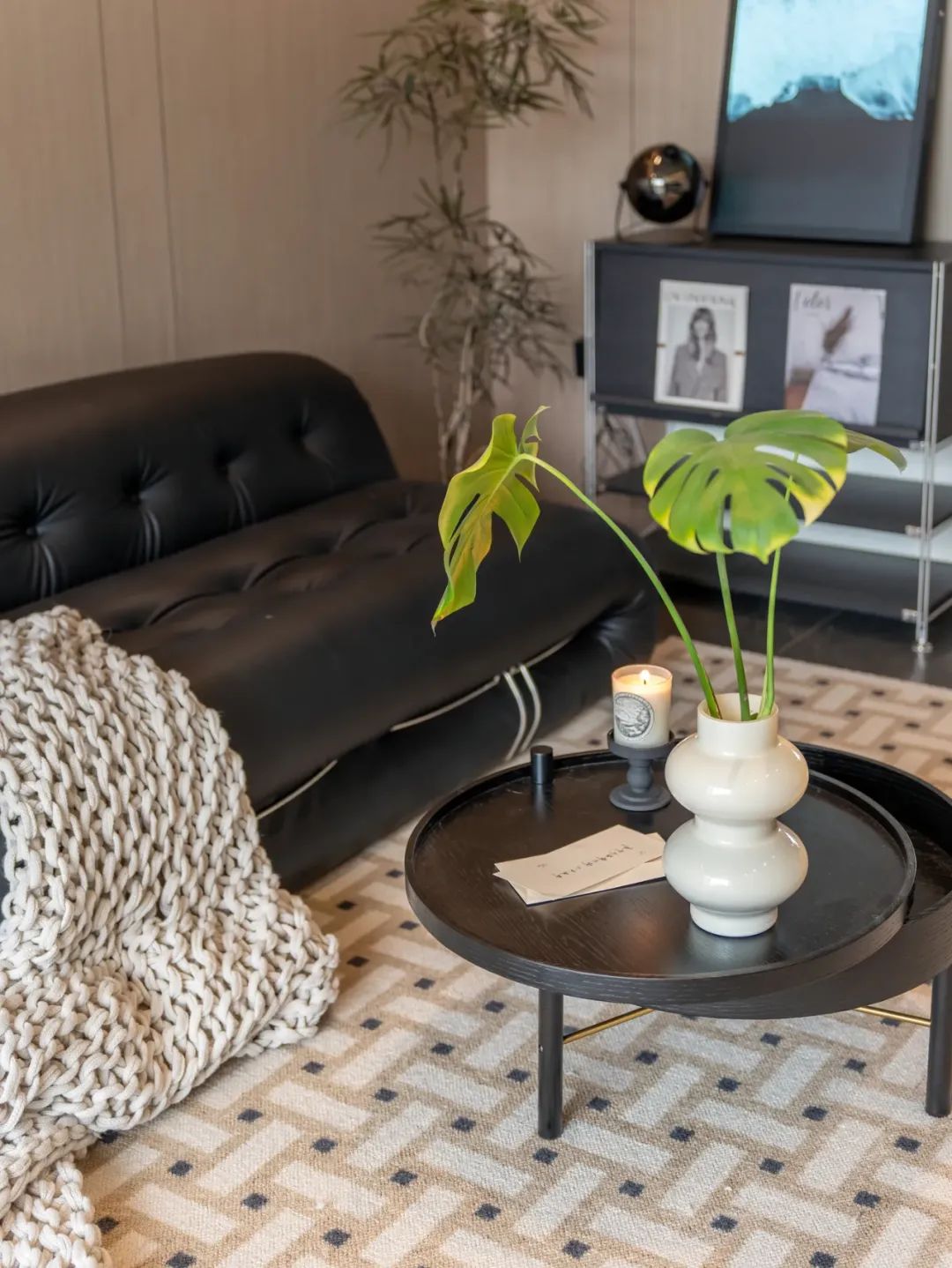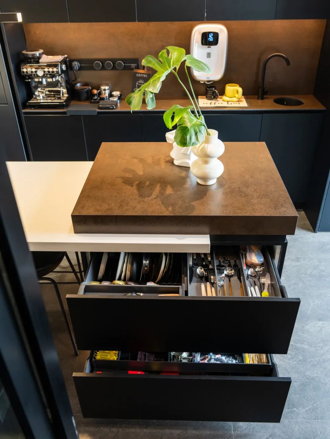 移步至意式风格的餐厅,2.77×5m 的空间,以⚫️⚪️🟤为主色调,尽显低调奢华。哑光纯黑色的板材,有着独特的光泽,质感十足。