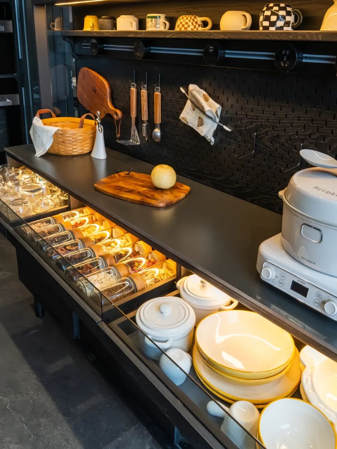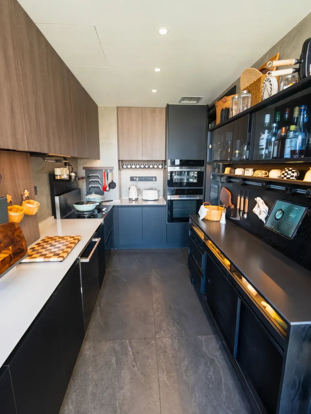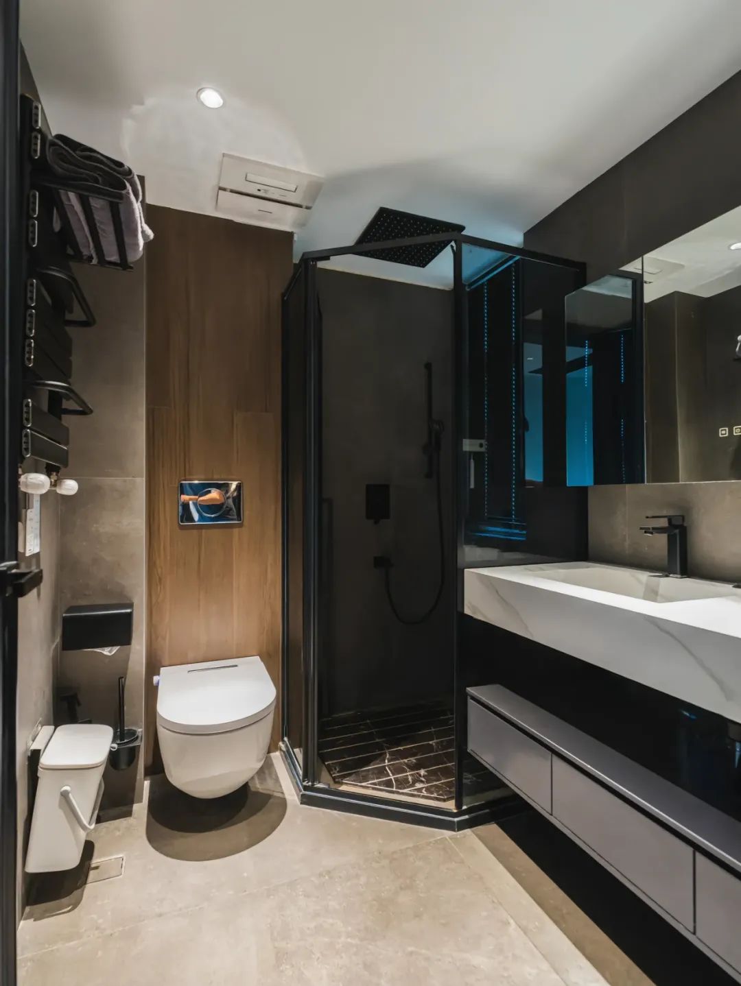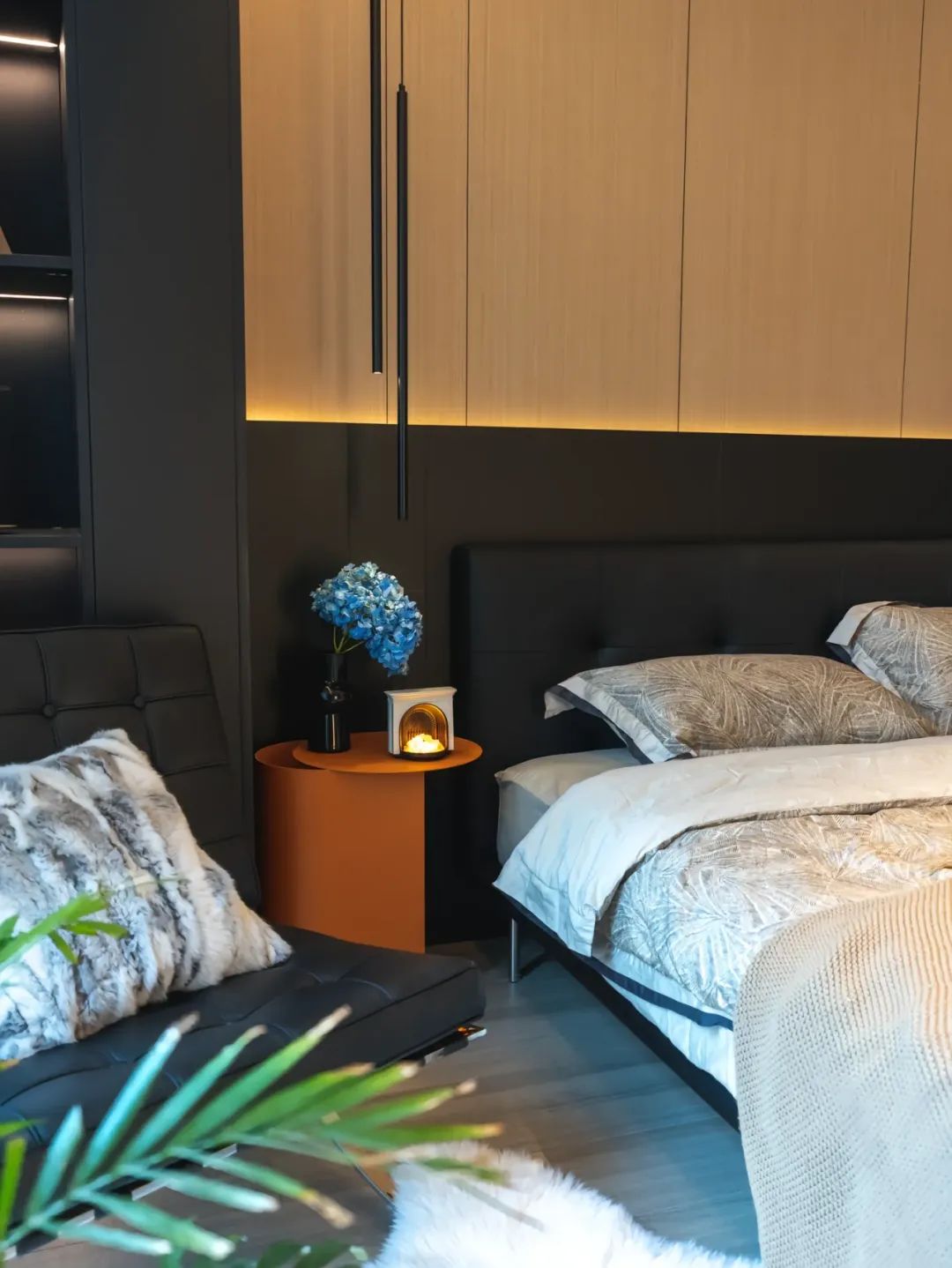 移步至意式风格的餐厅,2.77×5m 的空间,以⚫️⚪️🟤为主色调,尽显低调奢华。哑光纯黑色的板材,有着独特的光泽,质感十足。