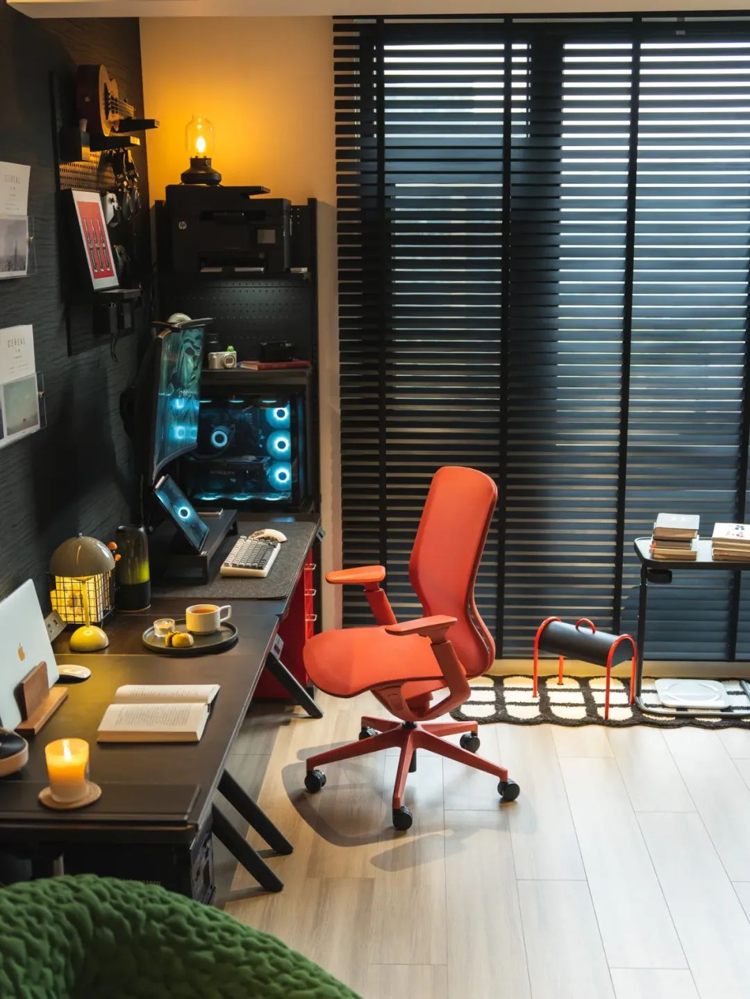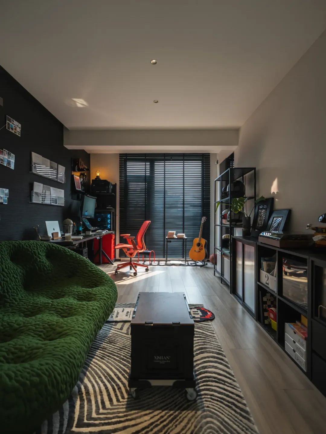 15平的书房兼独立娱乐室,宛如一个充满魔力的空间。酷炫的风格,舒适的桌椅,温暖的沙发,大大的投影以及新颖的游戏设备,这里填满了快乐