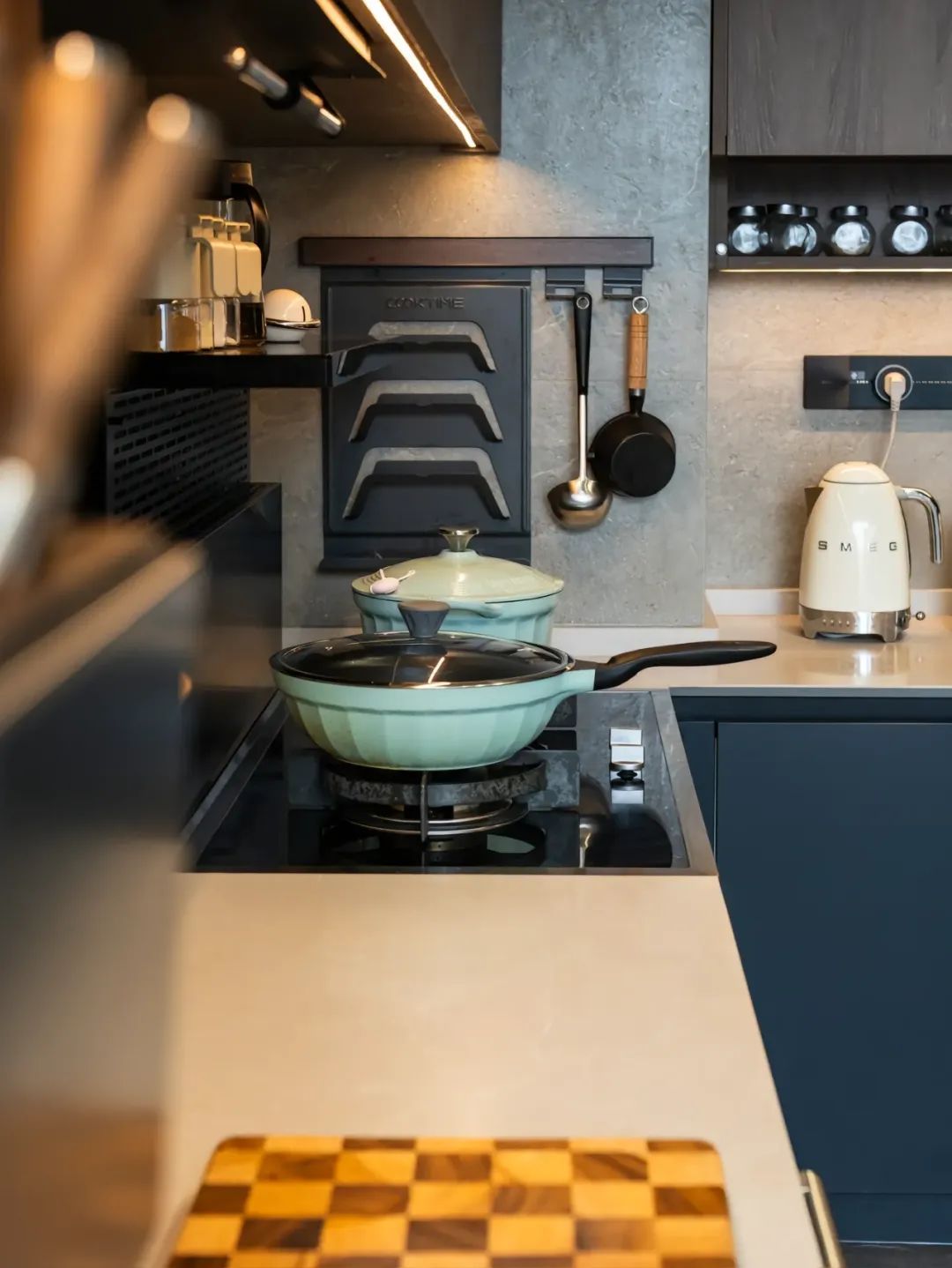 厨房虽小,却暗藏玄机。五金挂件必需品基本挂墙,大大减少了台面的压力。每一件工具都经过精心挑选,只为让色调搭配更加和谐。