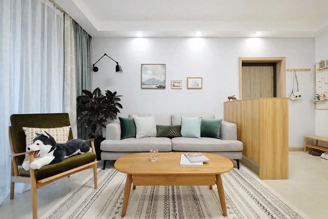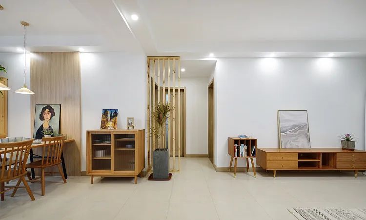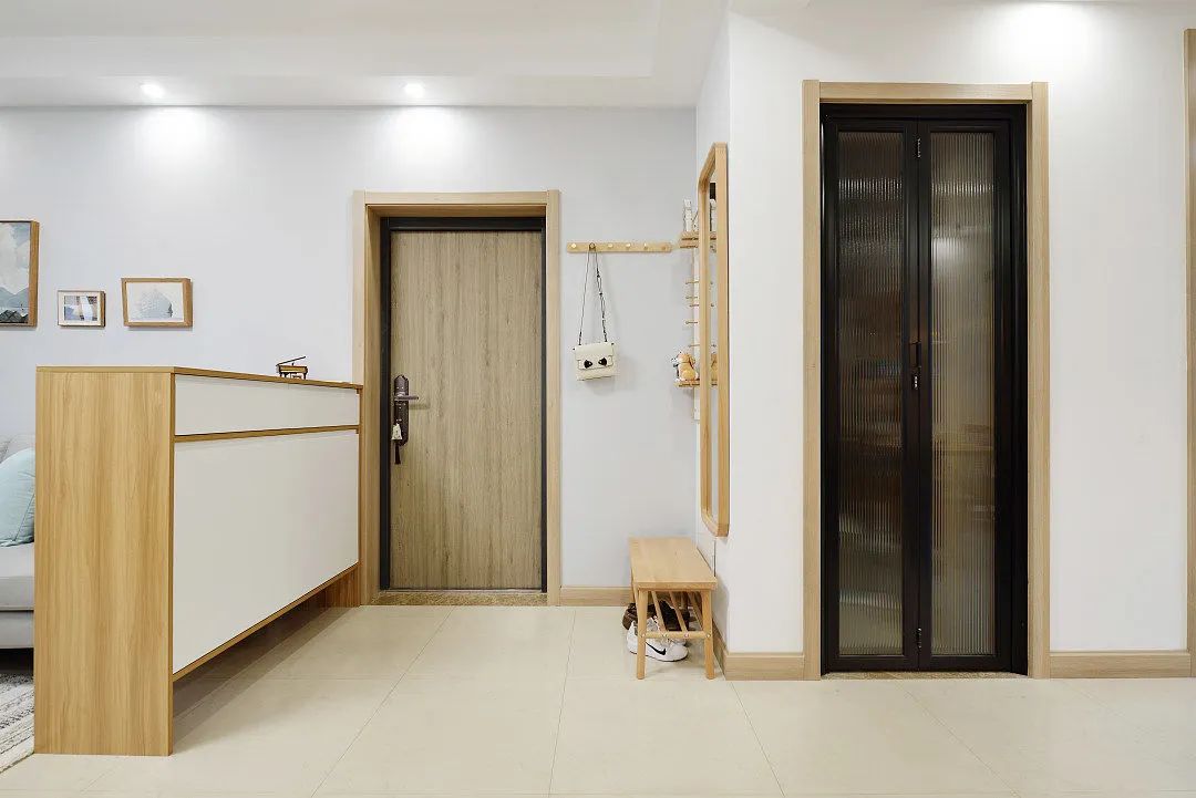 进门增加隔断柜界定空间,实现独立完整的玄关区域,半高隔断柜增加收纳又维系了空间通透。