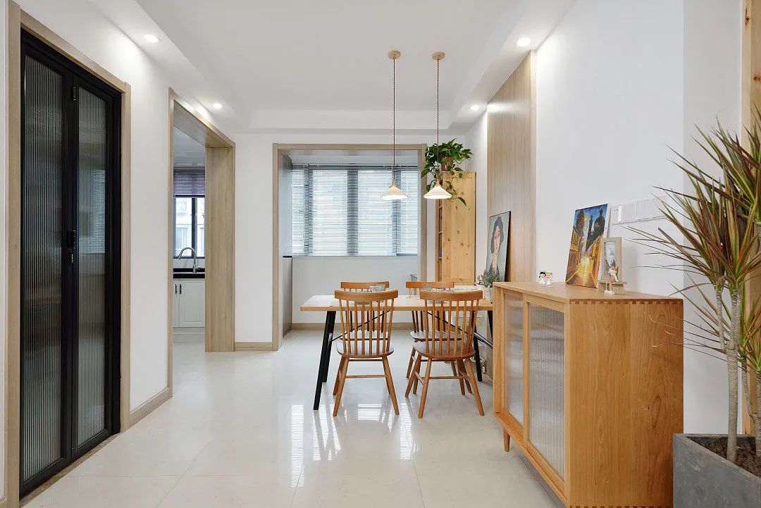 从客厅看去餐厅的效果。以浅色调为主,墙壁和天花板刷成白色,搭配浅色地砖,使整个空间显得明亮宽敞。