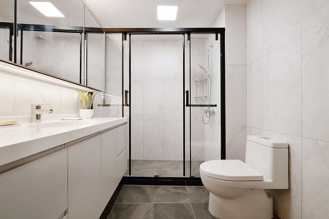 卫生间浴室的墙壁和地板分别采用了白色瓷砖和深色地砖,营造出干净明亮的氛围,而且耐看耐脏
