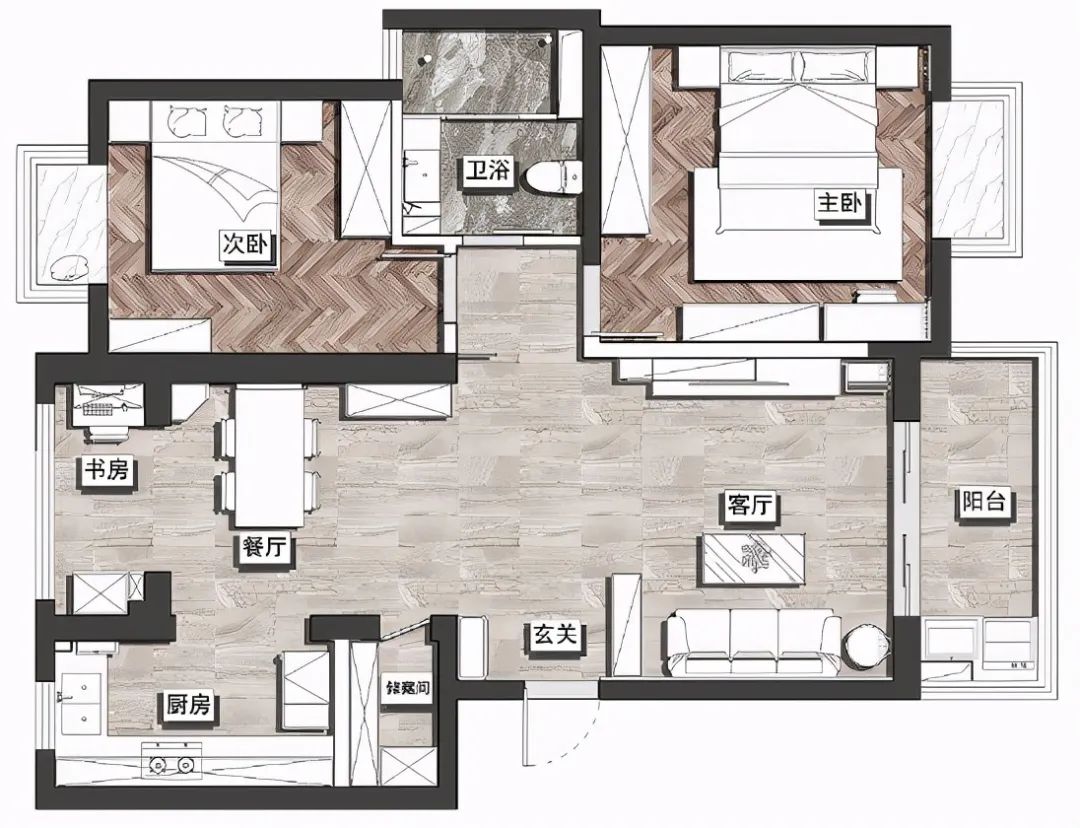 公共区域用瓷砖,卧室区域也难搞木地板,厨房做开放式的,餐厅一侧各处小书房,另外还有一个储物间,空间规划的很实用。