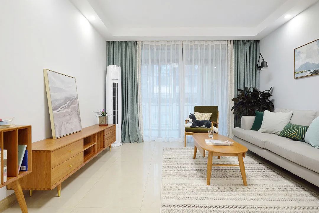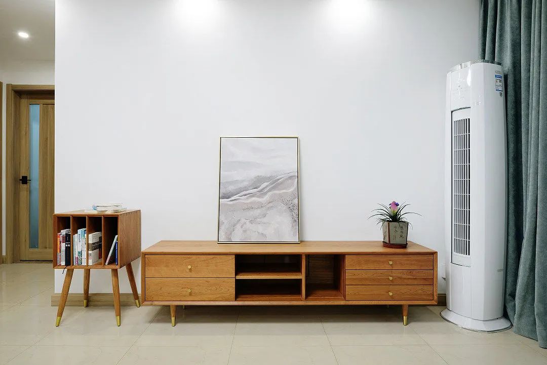 电视墙就是刷大白墙,配上一组木质电视柜,柜上摆放着一幅抽象画和一盆绿植,右侧还有一台立式空调