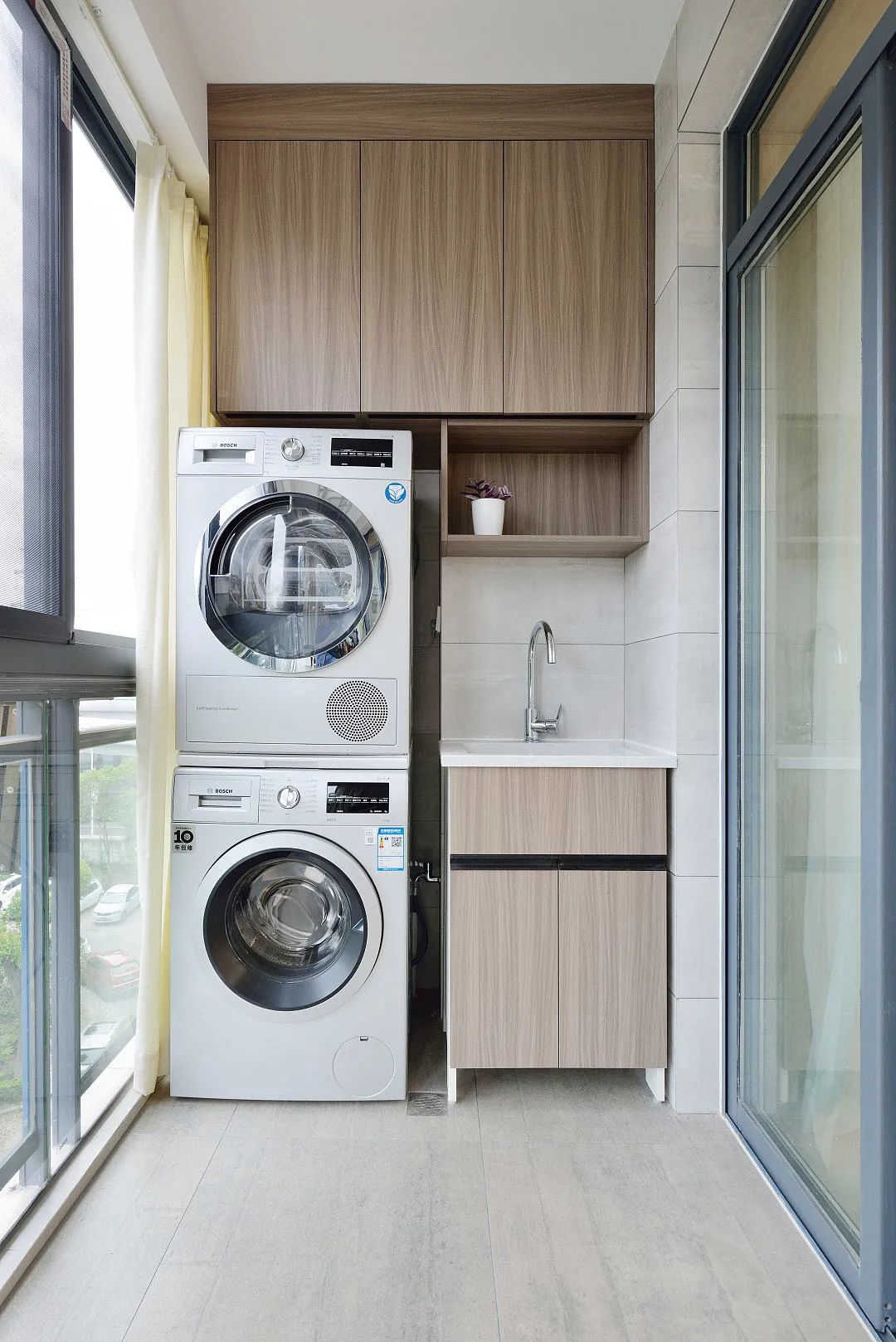 现代化的阳台洗衣房。左侧放置了一台洗烘一体机,上方还有一个独立的烘干机,两者均为白色,显得非常简洁。