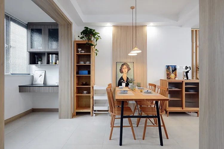 餐厅的背景墙上挂着一幅人物画像,增添了艺术气息。左侧是木质储物柜,顶部放置了一些装饰品和绿植。左