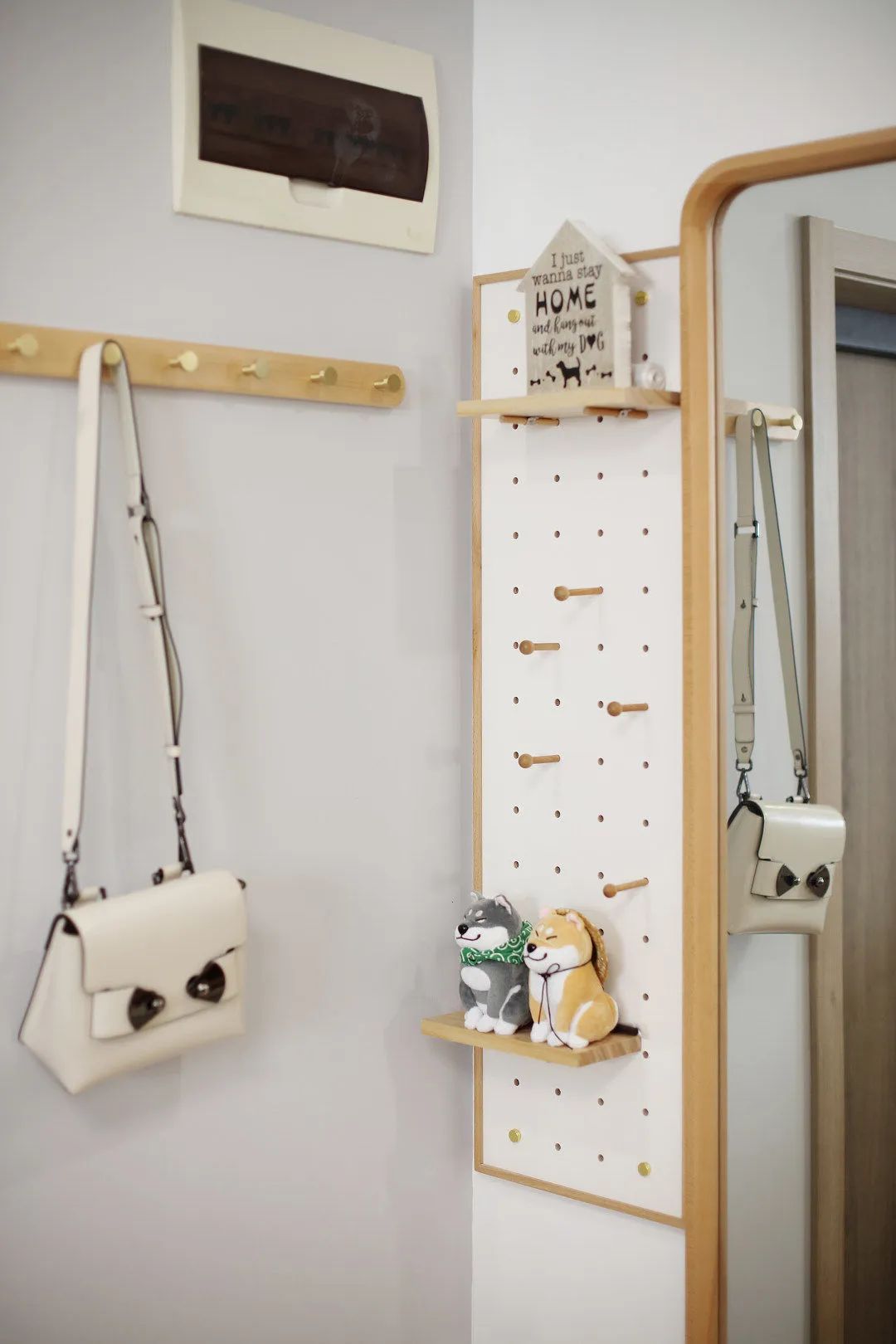 入户门玄关区域,整体设计简洁而生动。旁边的洞洞板有一个小木质隔板,隔板上摆放着两只可爱的柴犬玩偶,给整个空间增添了一份温馨和趣味。