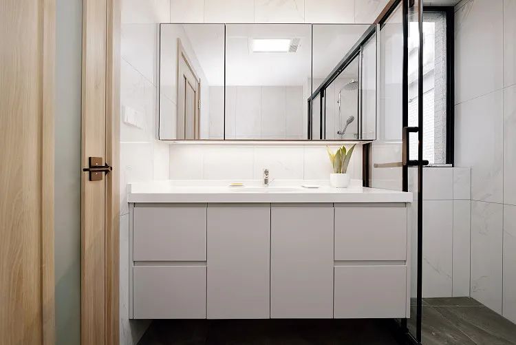 白色洗手台上方安装了三面镜面柜,丰富收纳功能。镜子下方有照明灯,使得更亮堂,干净。