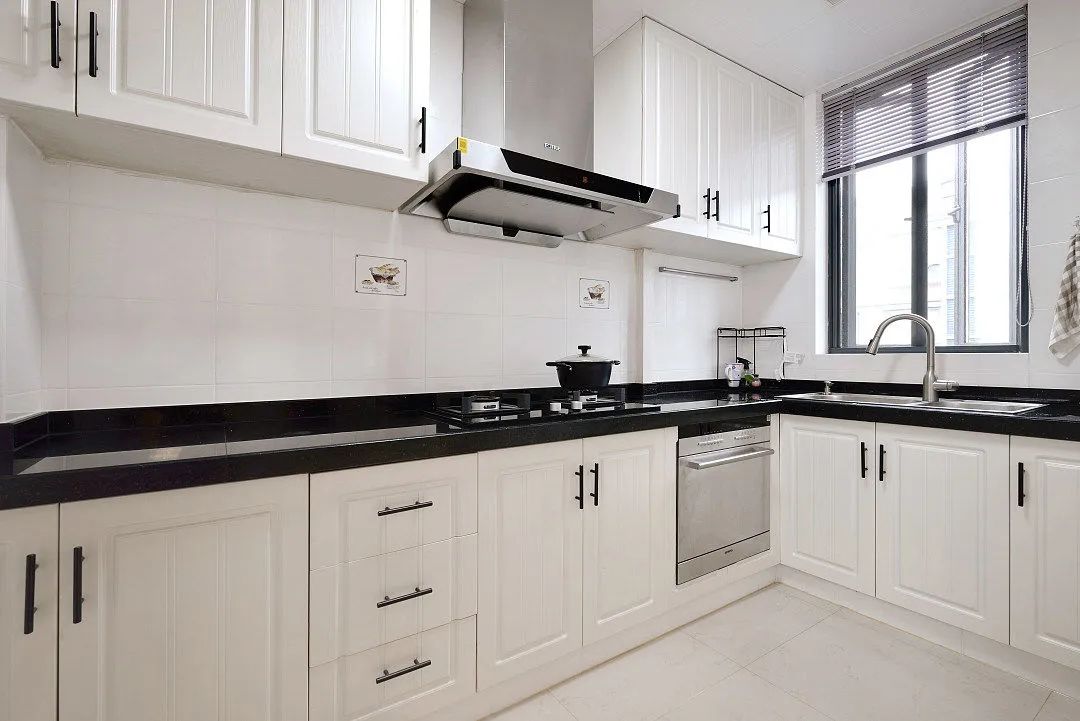 厨房整体采用简约设计,以白色为主基调,搭配黑色台面,显得干净整洁