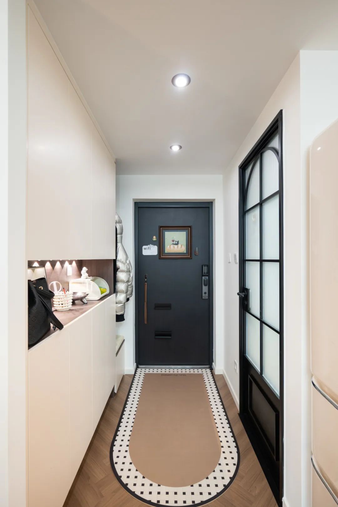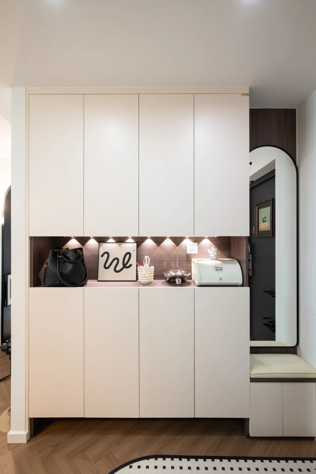 柜子选择简约白+黑胡桃,中间镂空摆放部分零碎,还安装了小山丘射灯,氛围拉满。右侧安装弧形镜+换鞋凳,功能满满