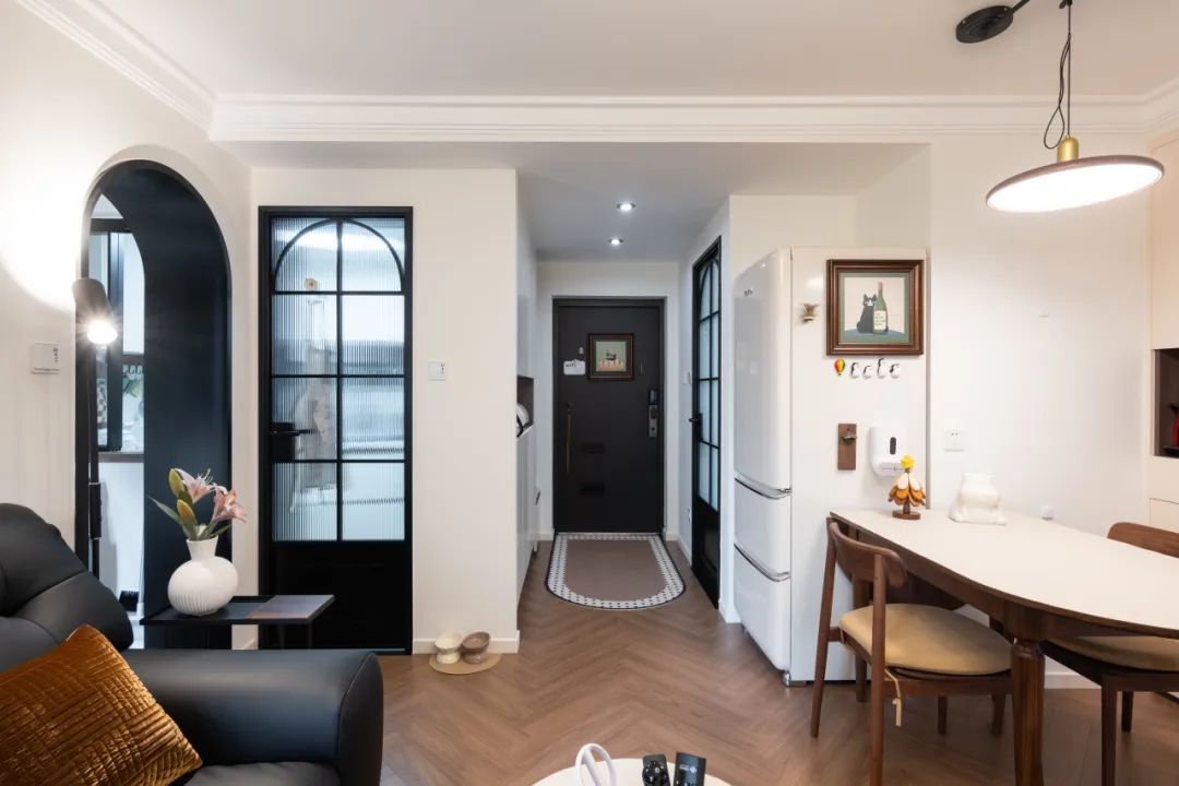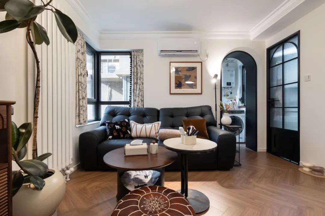 地板选择人字拼,纵深感十足,搭配黑色皮沙发,复古氛围浓郁。窗框、门框都选择黑色系,形成呼应。