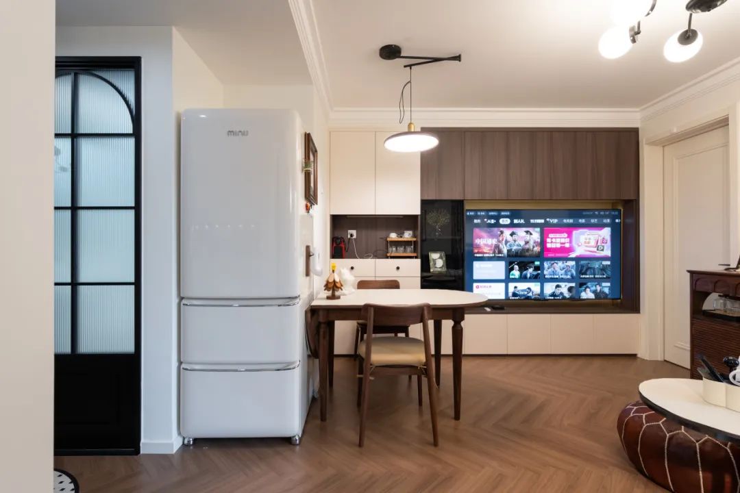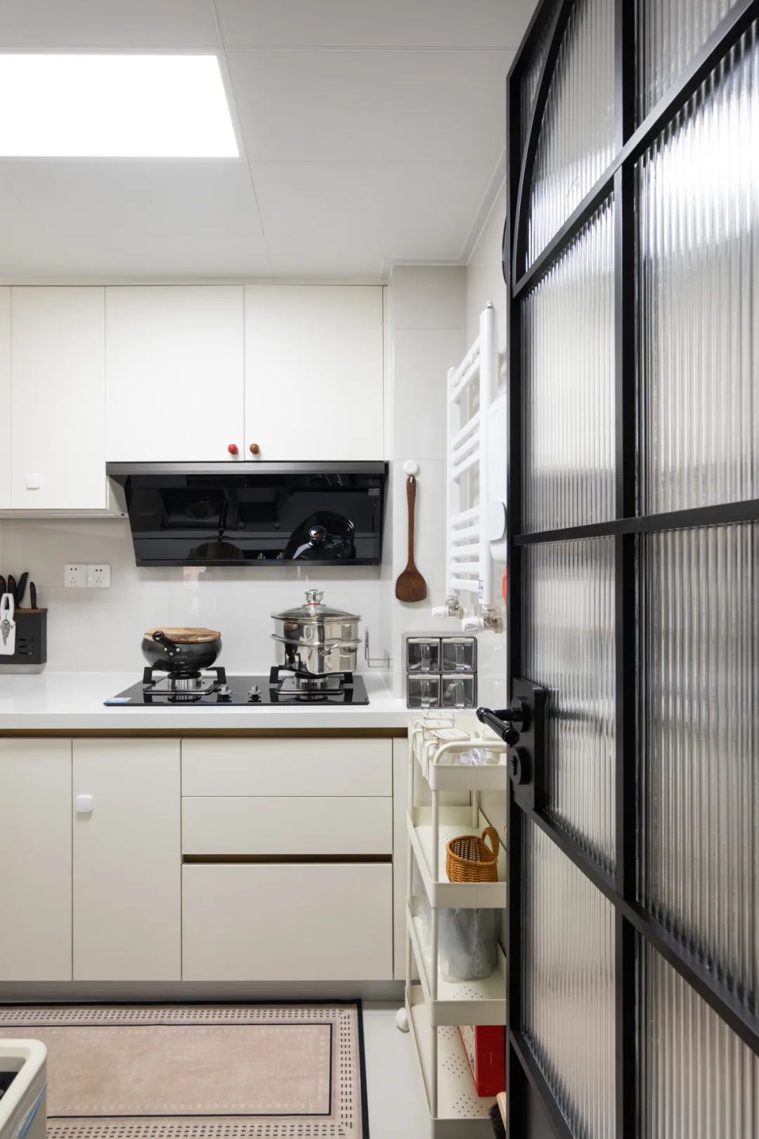 厨房选择长虹玻璃门,搭配黑色细框,透光又美丽。厨房空间较小,因此选择整体白色,显大通透。