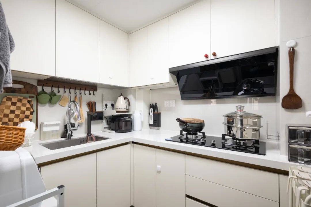 L型厨房,洗-切-炒动线流畅。充分利用垂直空间,能上墙的都上墙。