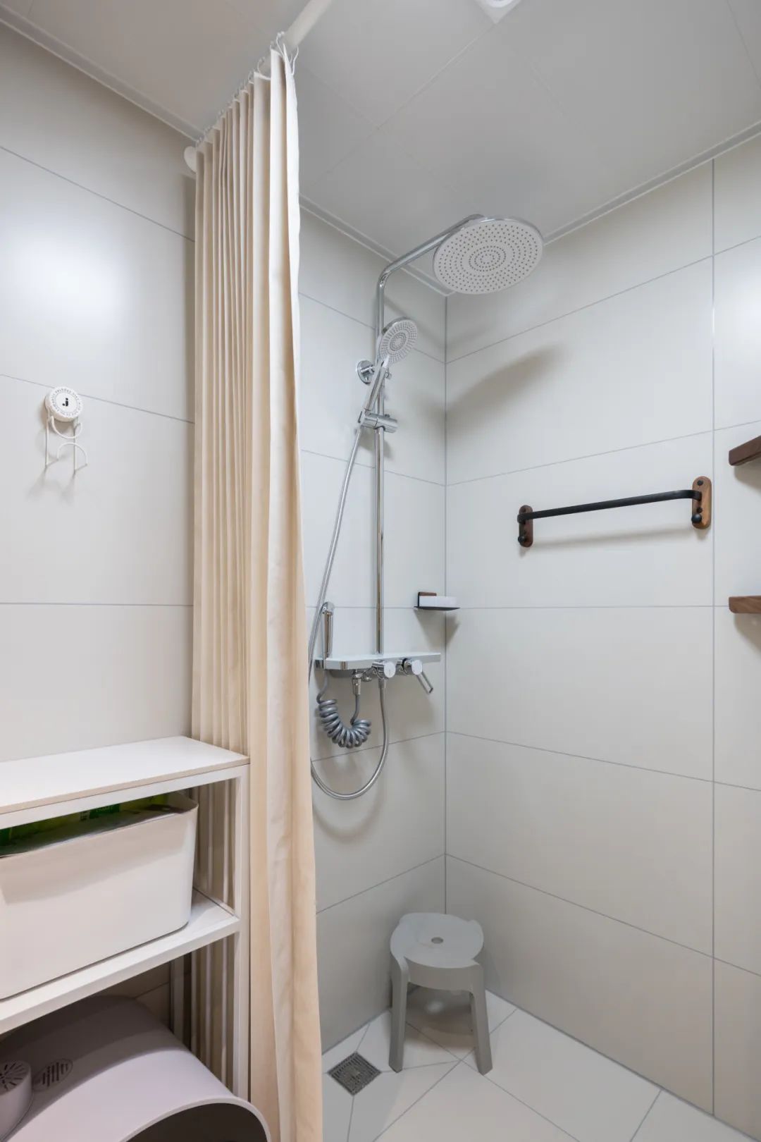 淋浴区外扩,用淋浴帘隔断,保证干湿分离,墙地砖都选择米白色,干净显大。