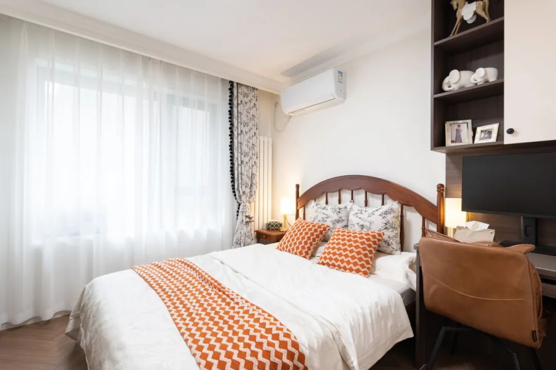 卧室选择白色搭配胡桃色,用橙色软装跳色,温馨治愈。窗帘花色和抱枕呼应,和谐统一。