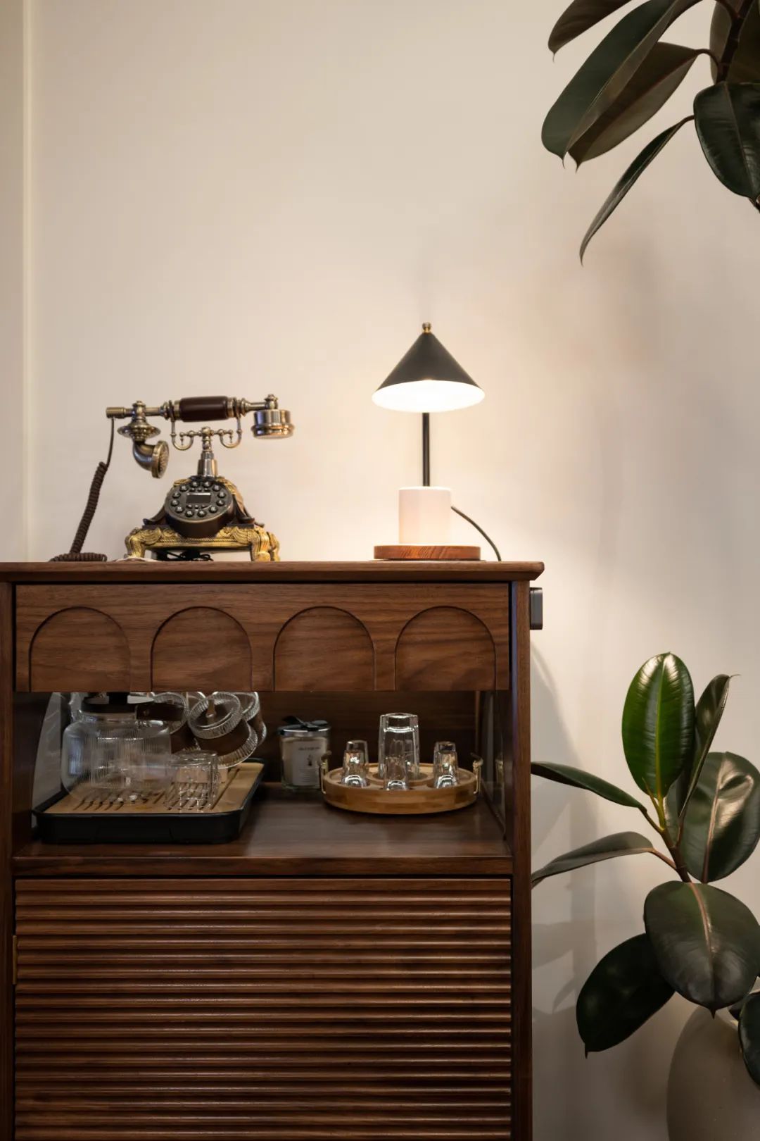角落选择复古摆件,搭配绿植和弧形元素,空间更柔和有韵味。