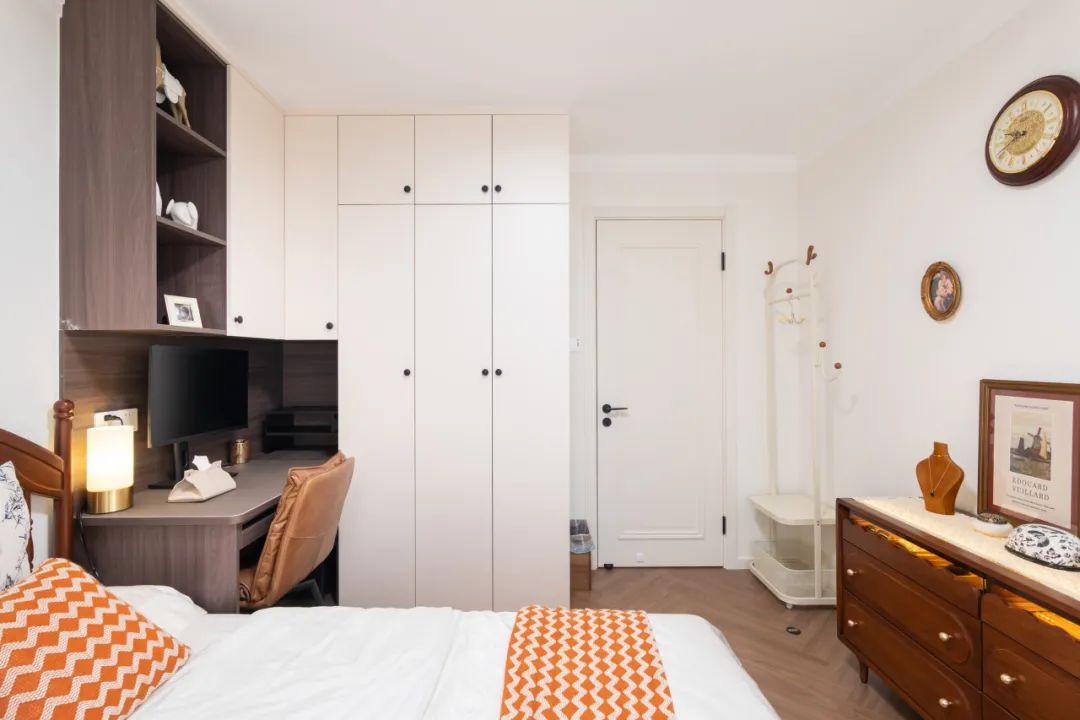 卧室定制了L型衣柜+书桌一体式,配色仍然是白色+黑胡桃木,颜色三七分,视觉干净整洁。