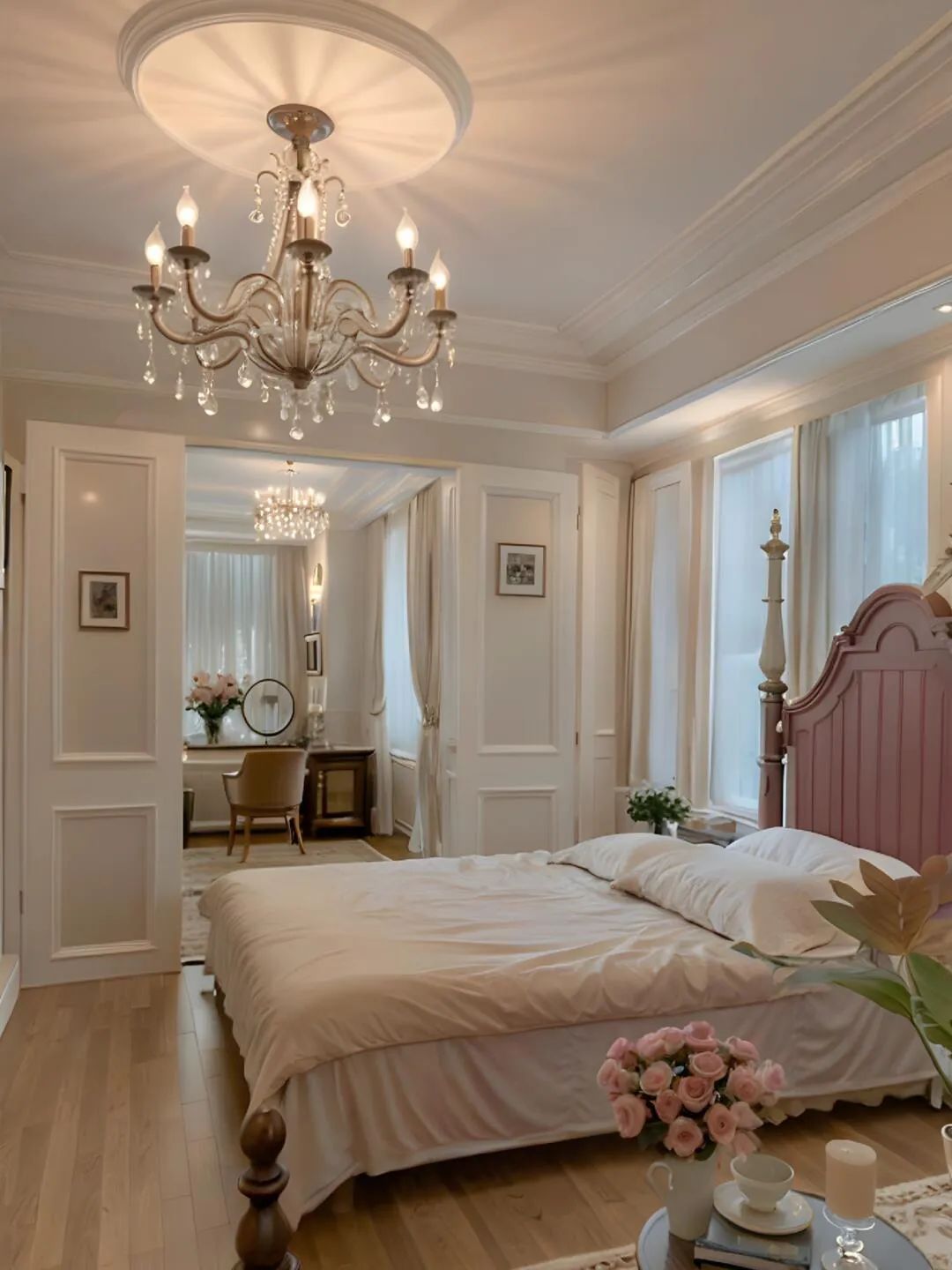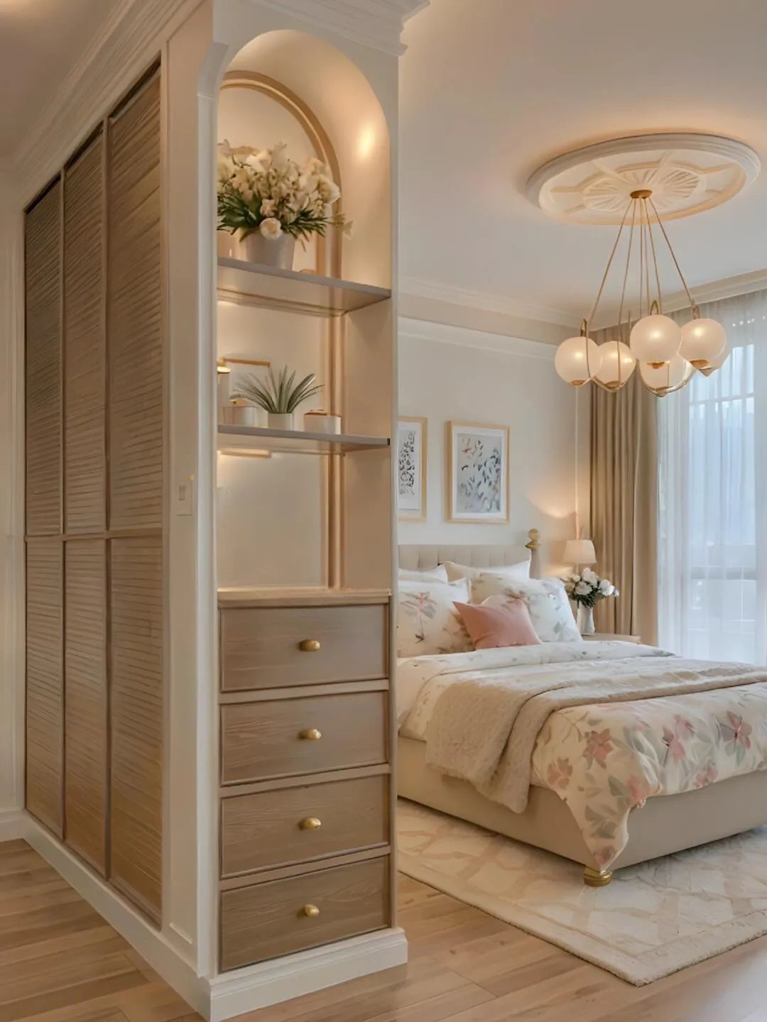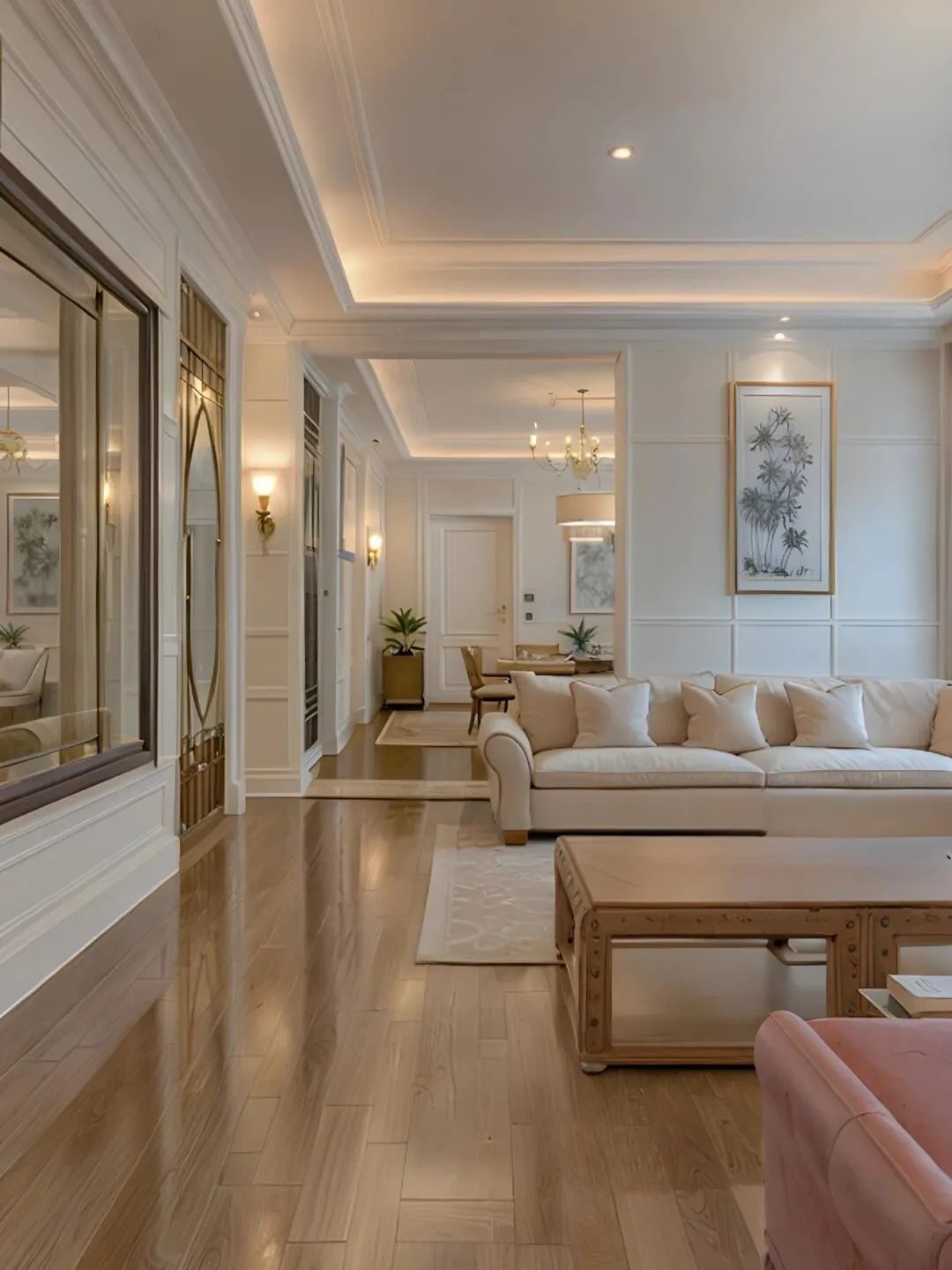 粉白软装的气息扑面而来浅色的 L 型沙发上,整齐地摆放着多个同色系的靠垫,柔软的材质让人忍不住想要躺上去放松一下