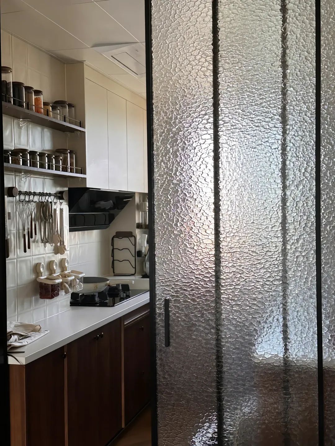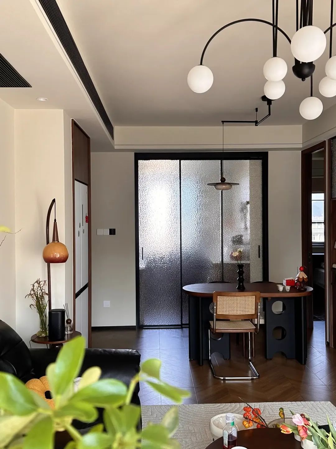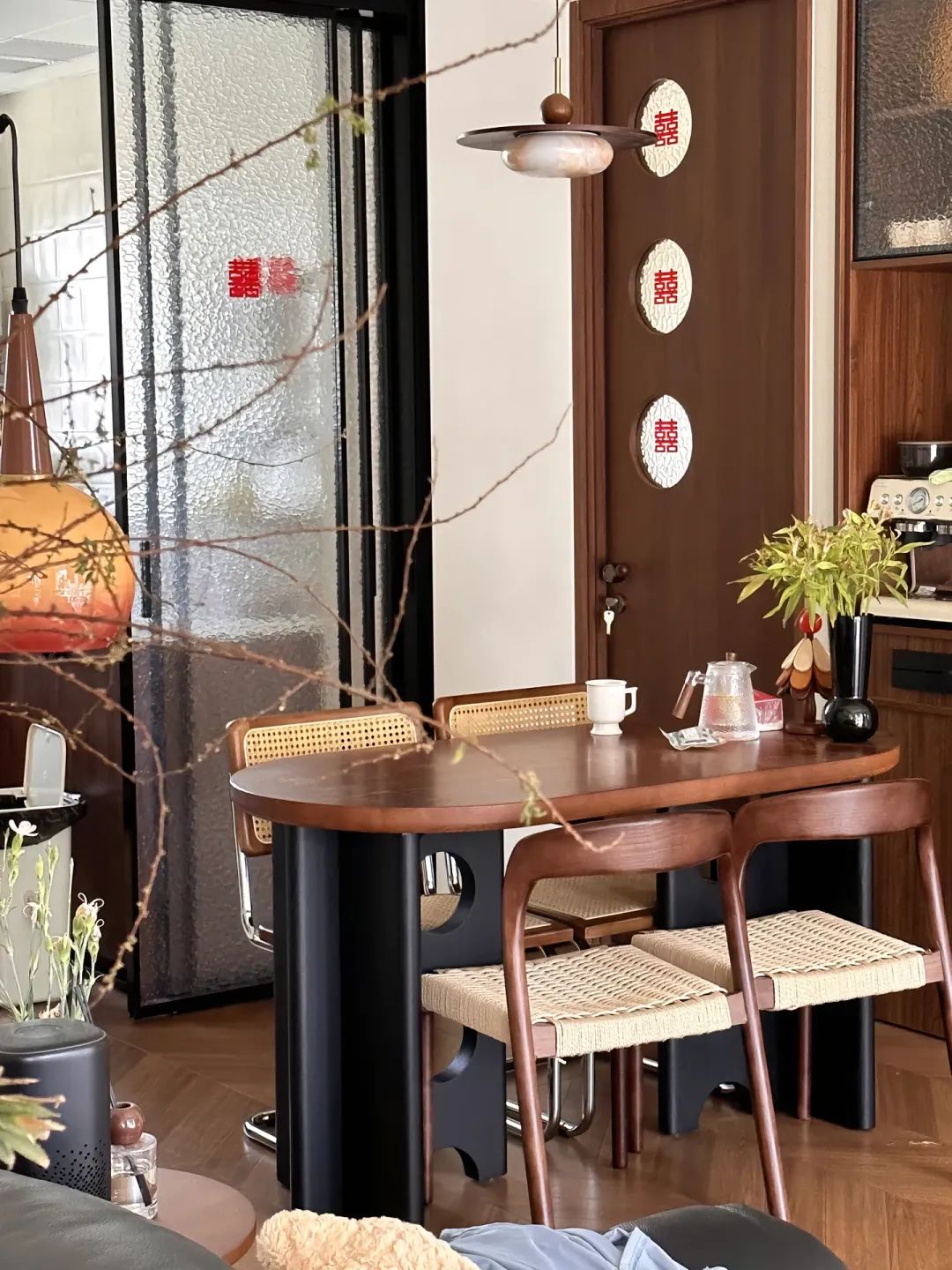餐厅定制了胡桃木色的餐边柜,搭配季居家的中古风餐桌。