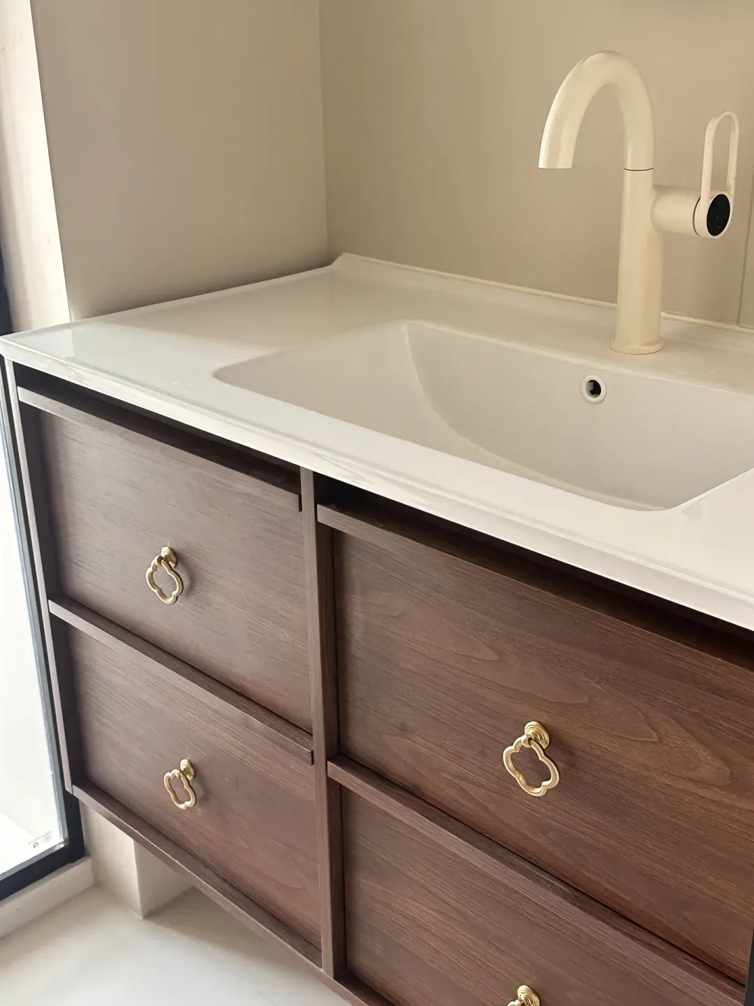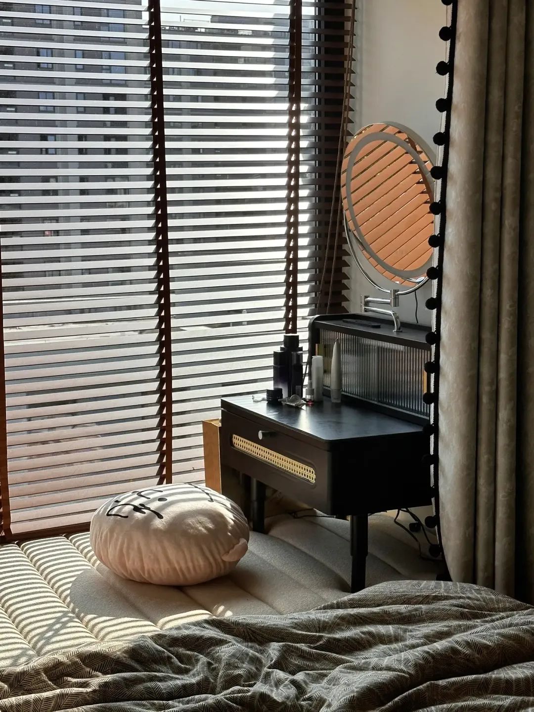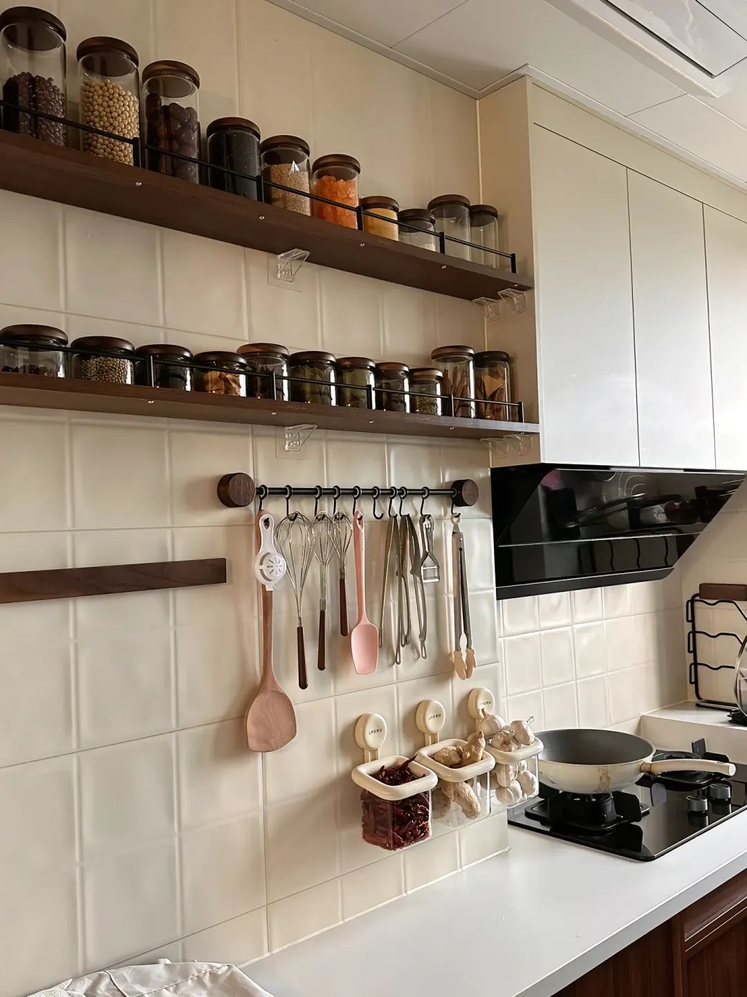 餐厅定制了胡桃木色的餐边柜,搭配季居家的中古风餐桌。