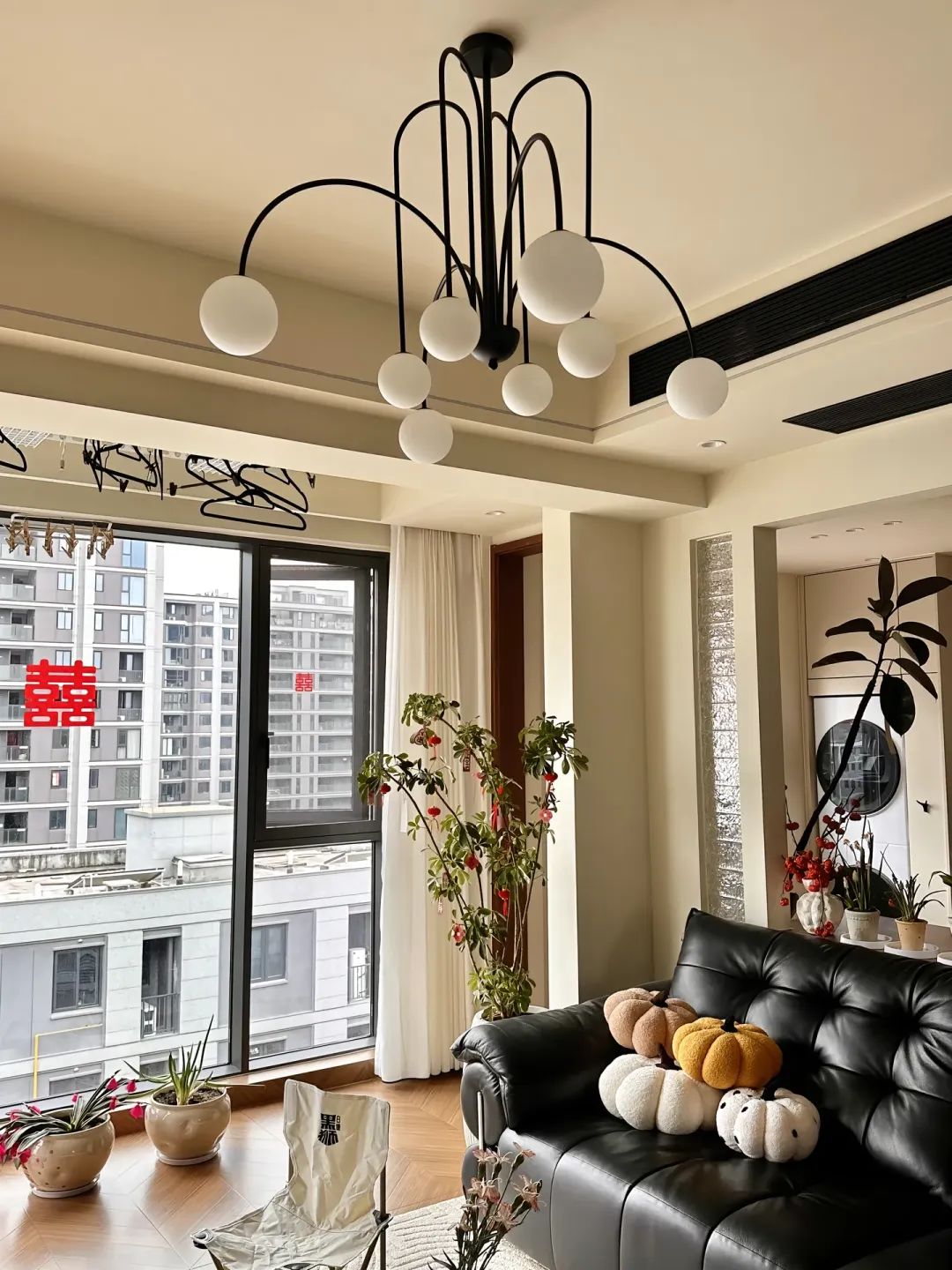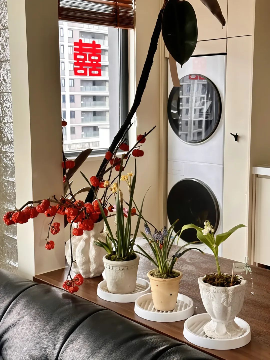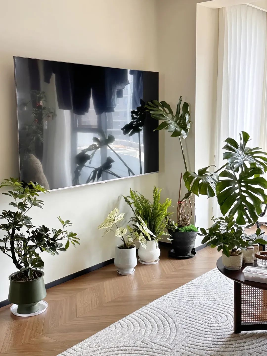 全屋通铺木纹砖,电视背景墙是简单的大白墙,放置屋主喜欢的绿植。