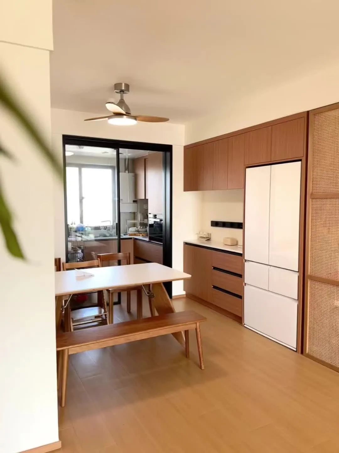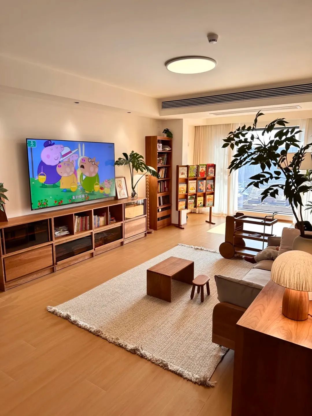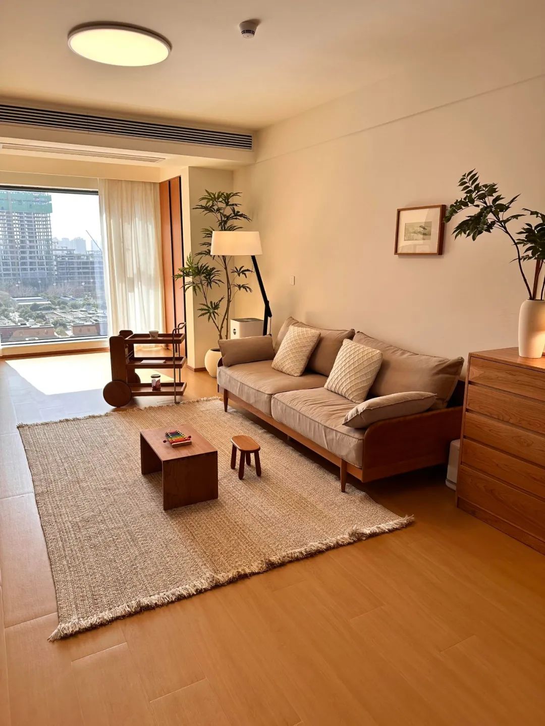 这个原木风小家的配色公式:60%白色+30%木色+10%点缀色。