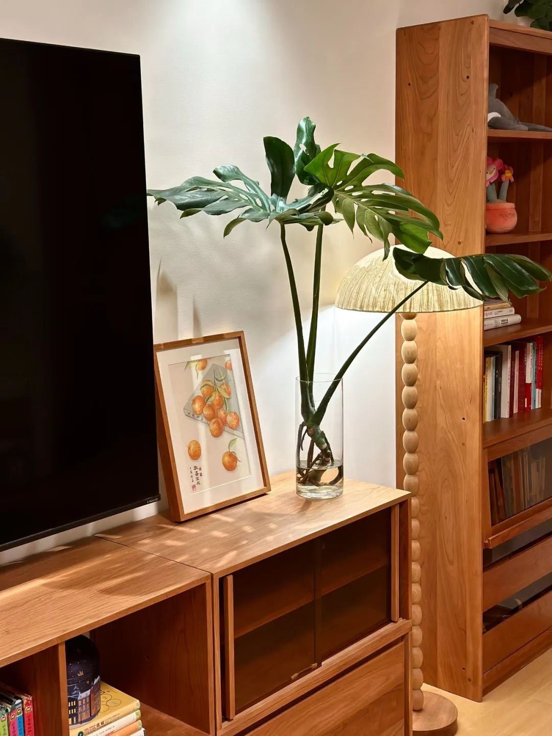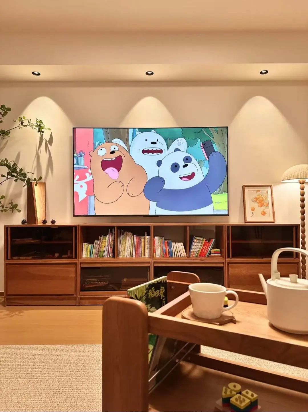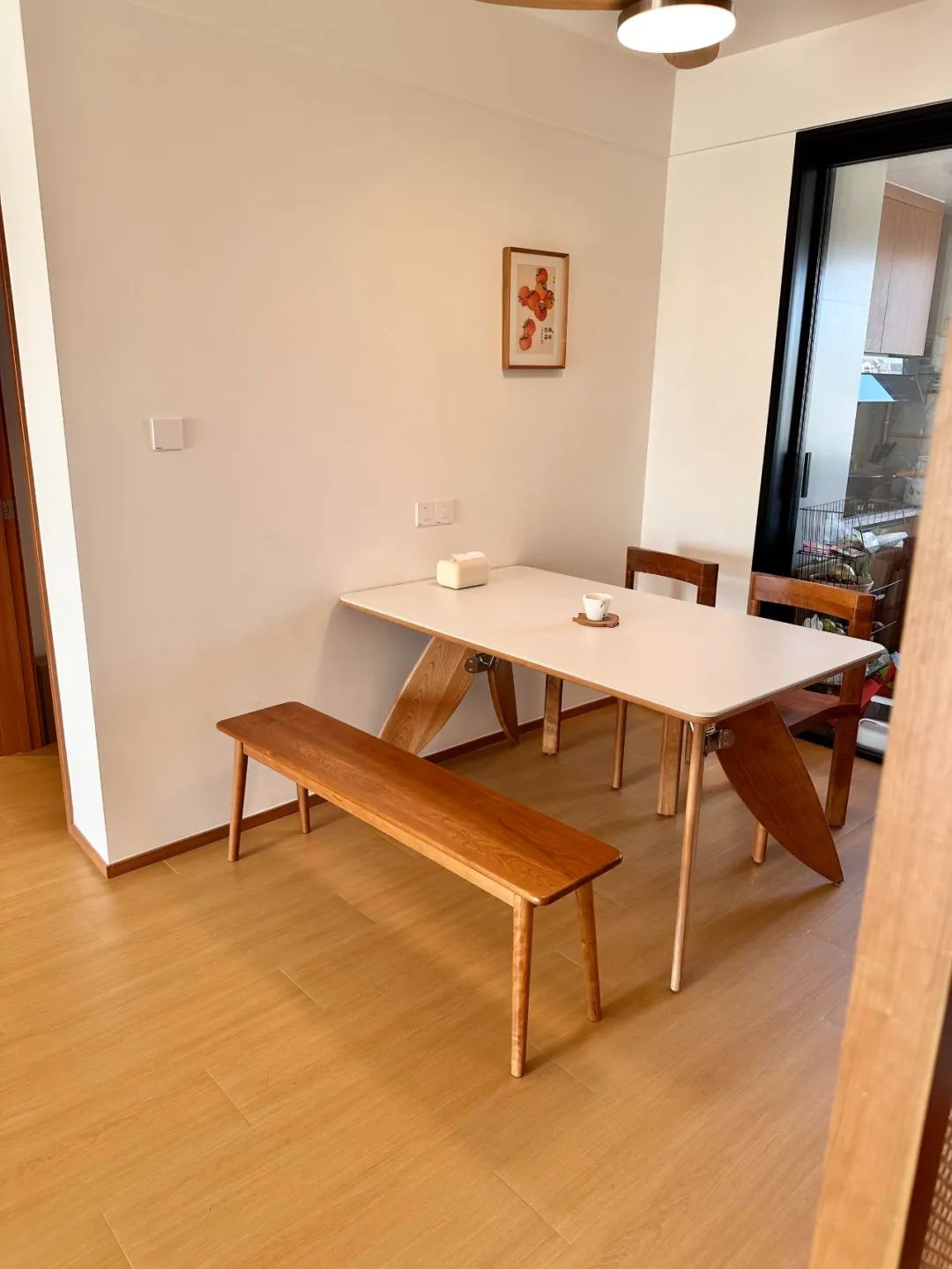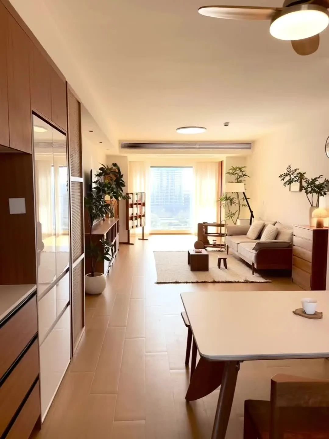 这个原木风小家的配色公式:60%白色+30%木色+10%点缀色。