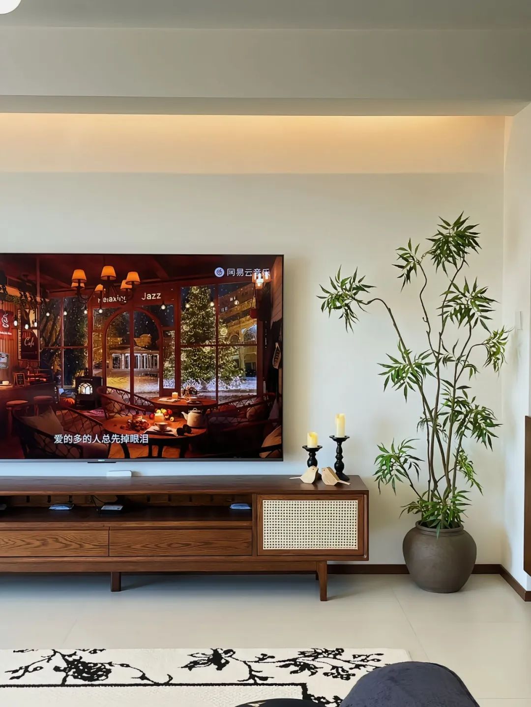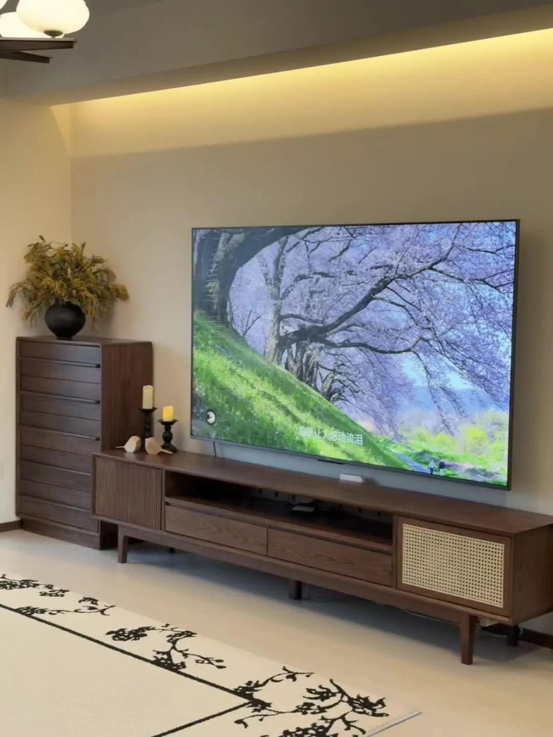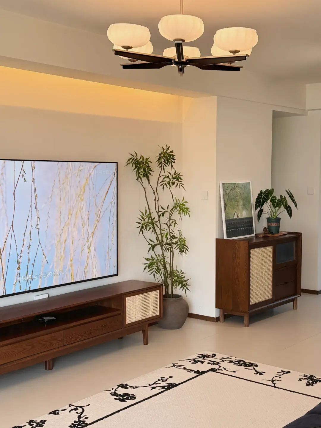 客厅开间6.4米,客厅一圈单眼皮吊顶,简单耐看。电视背景上方一圈暖色光灯带,带动整个背景墙的观影氛围感。