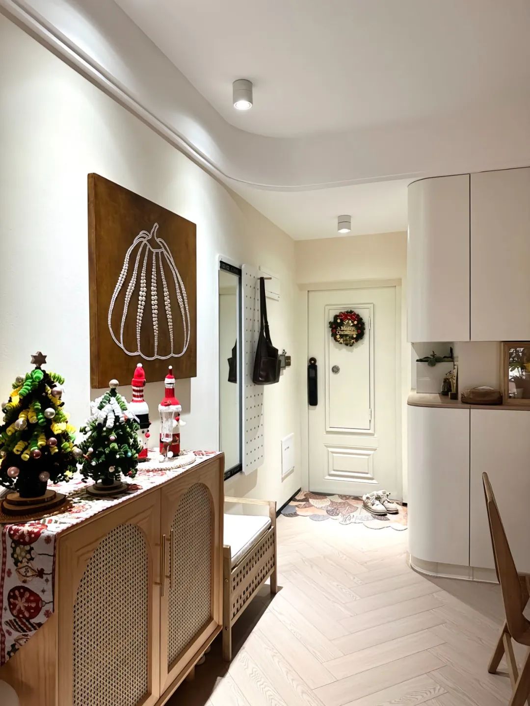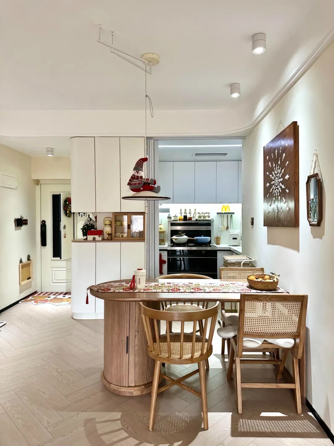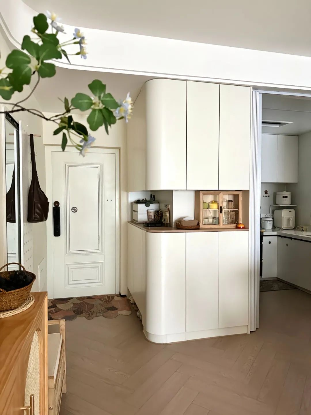 拆除厨房隔断,定制了玄关L型三面柜,把入户和厨房隔开,做了圆弧的柜门,既美观又防止磕碰。