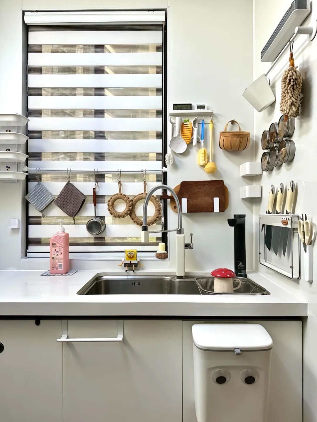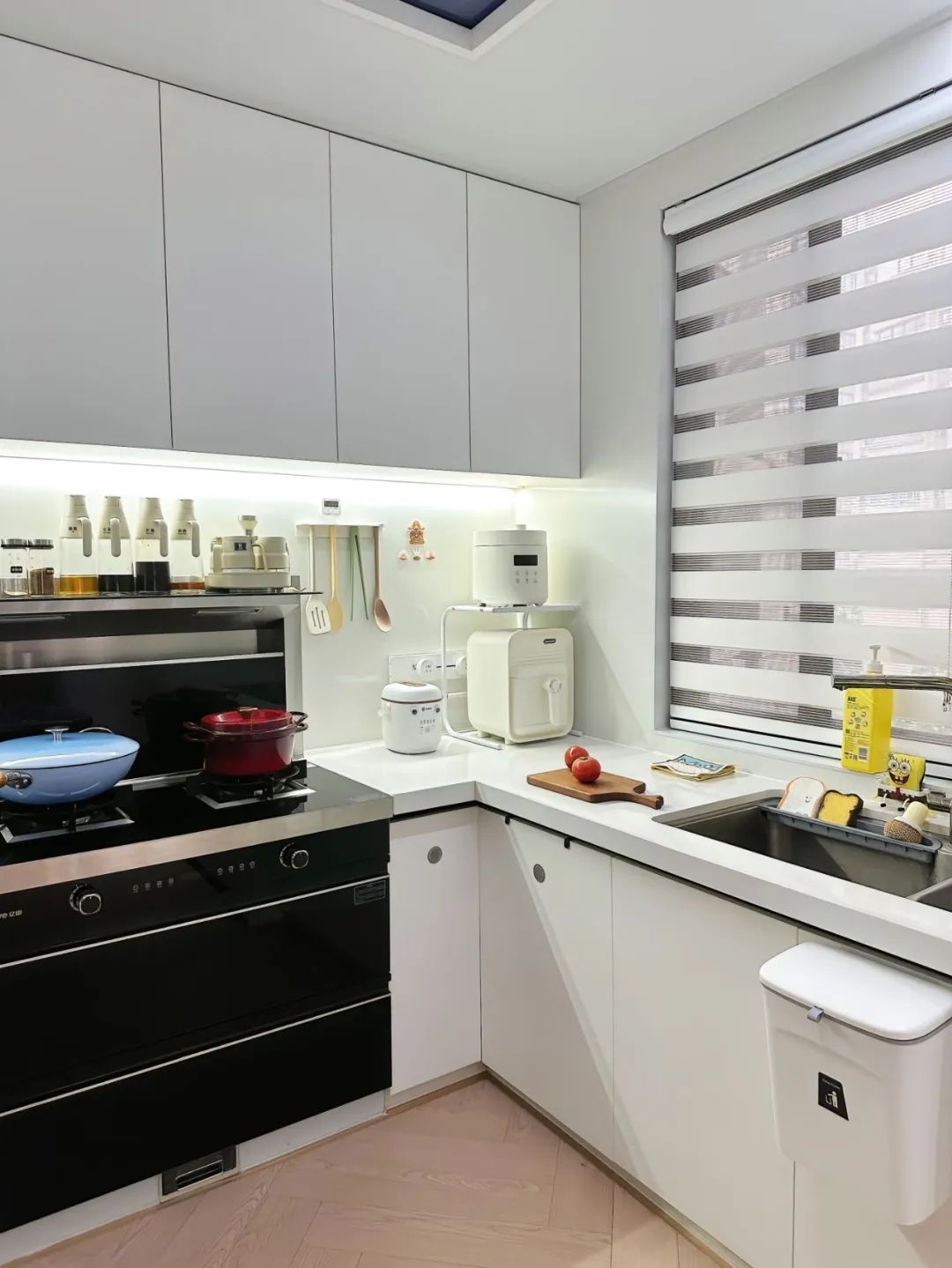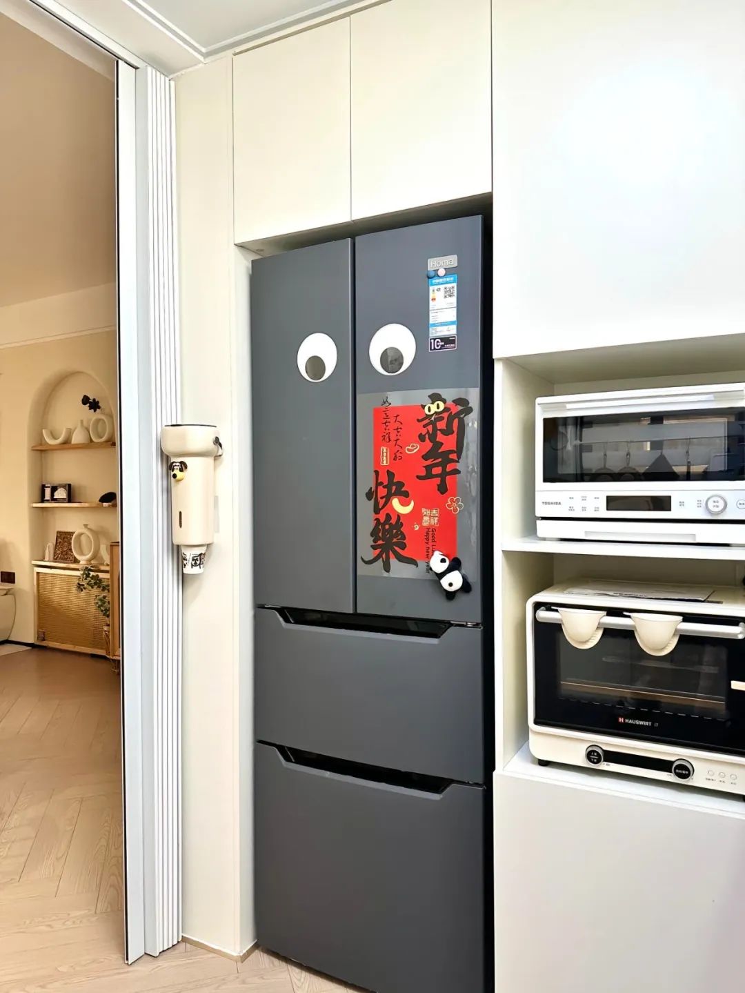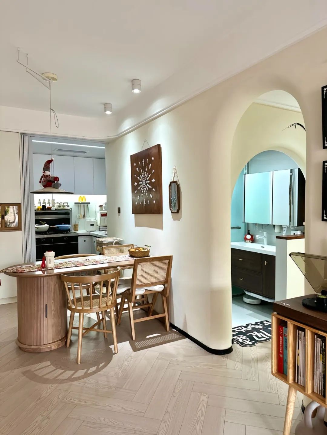 拆除厨房隔断,定制了玄关L型三面柜,把入户和厨房隔开,做了圆弧的柜门,既美观又防止磕碰。