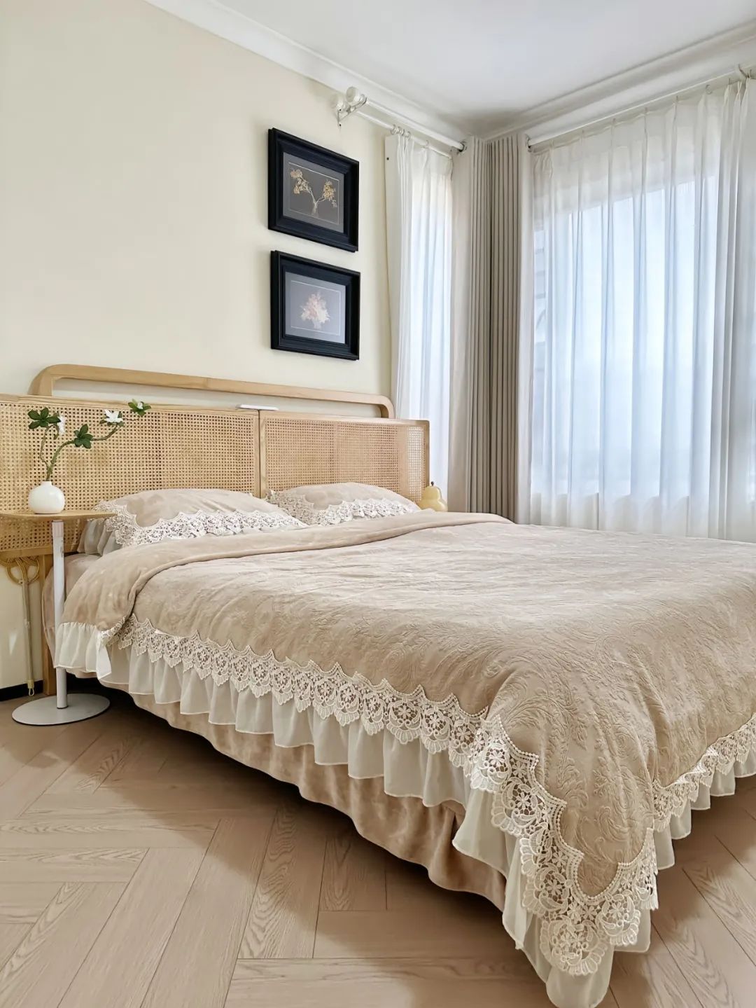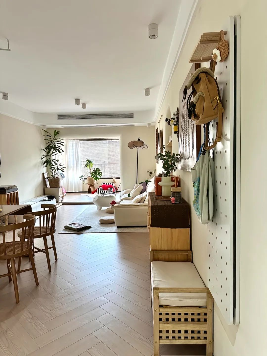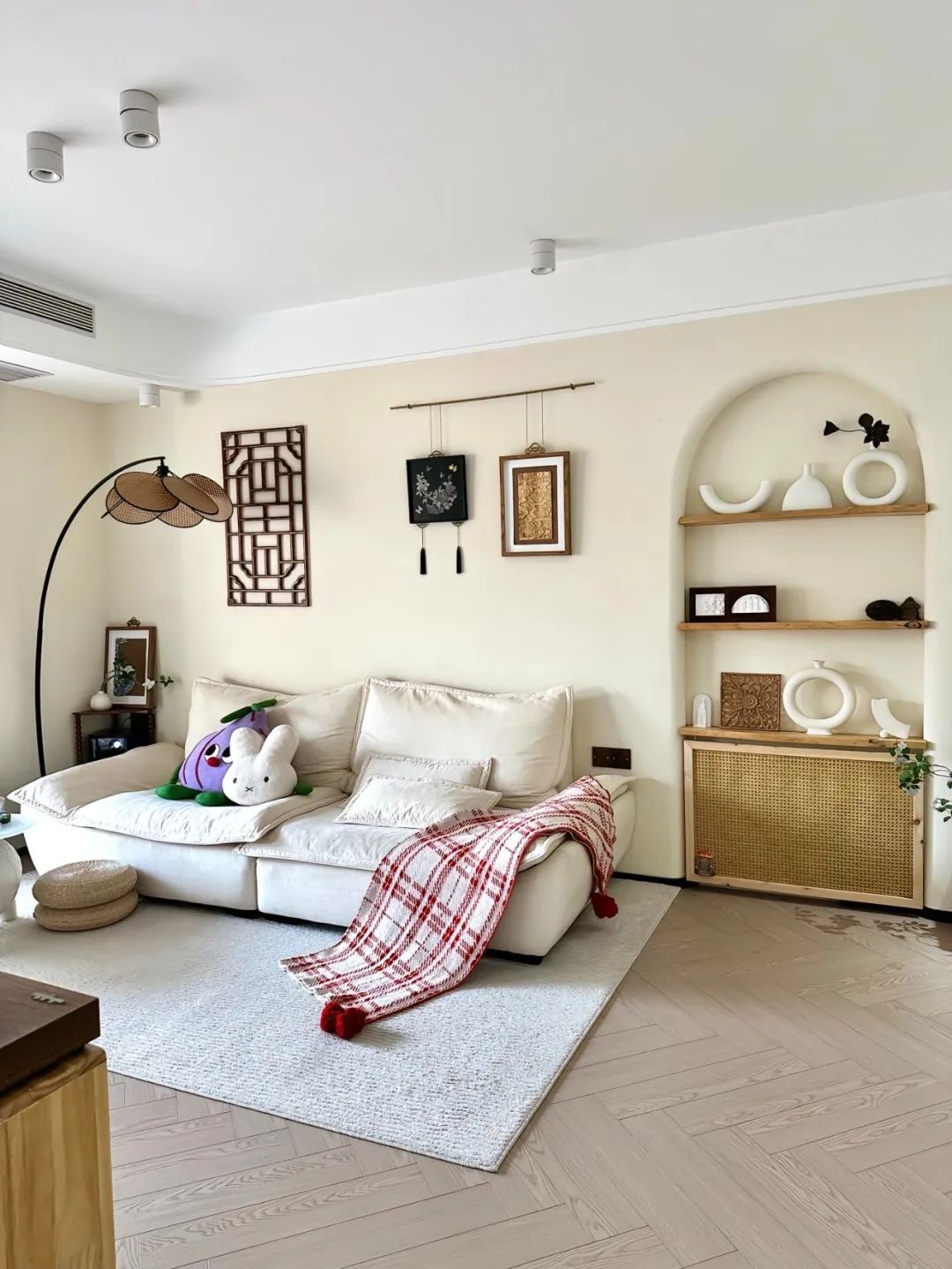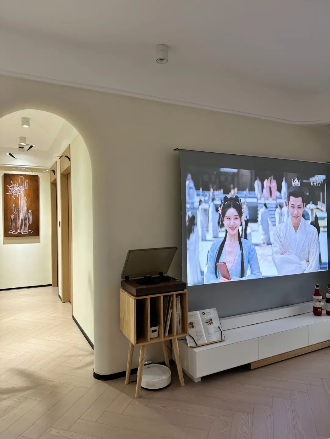 客厅开间3.3米,层高2.7米,双眼皮边吊,明装射灯,全屋人字拼木地板通铺,墙面通刷奶油淡黄色灰泥。