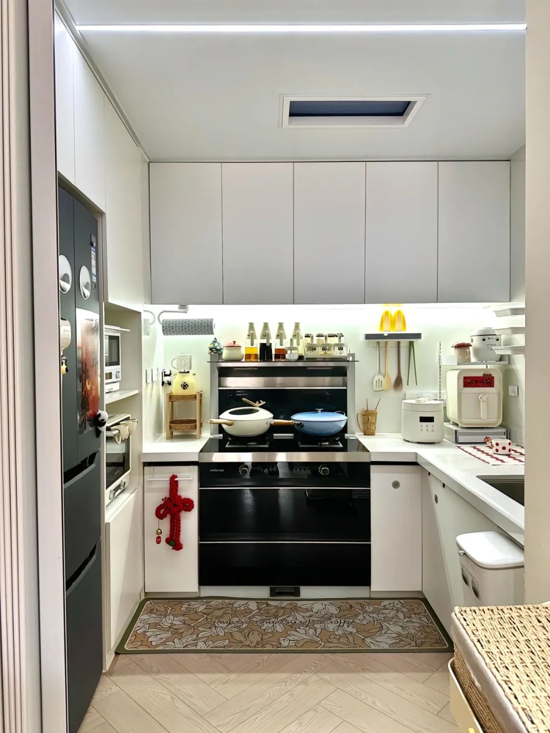 厨房面积4.5平,厨房使用PVC折叠门,U型布局,立柜+地柜+吊柜组合,增加收纳空间。