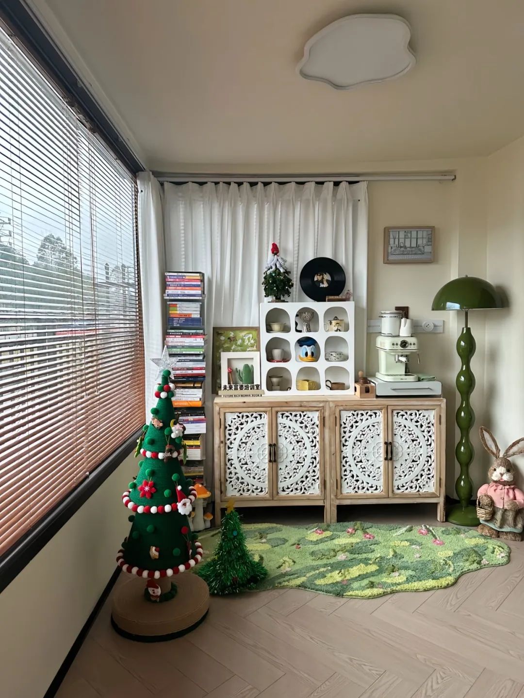 拆除阳台门,打通阳台客厅,阳台一边做成咖啡角,另一边改成书房,书桌+满墙书柜。